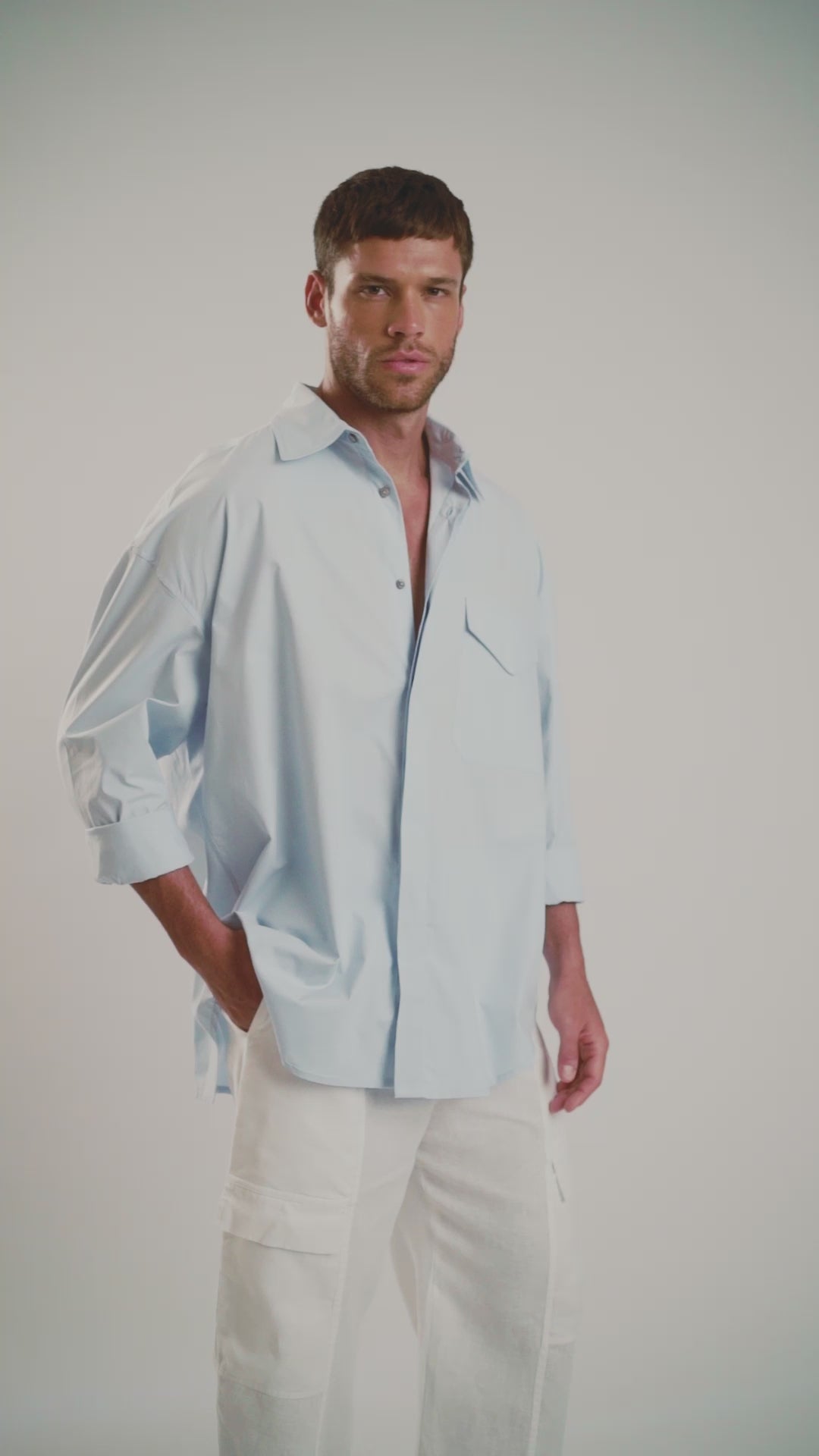 Camisa em algodão, de modelagem ampla, com manga longa. Possui bolso chapado com aba na esquerda, abotoamento frontal embutido e prega nas costas.