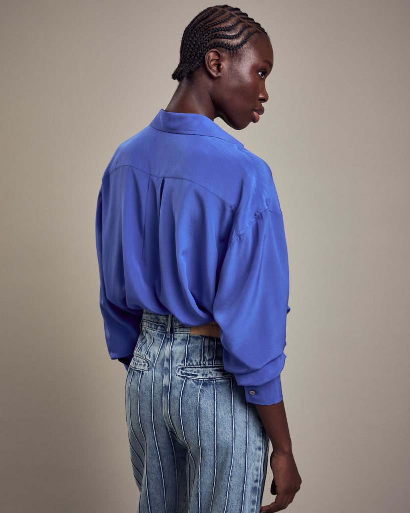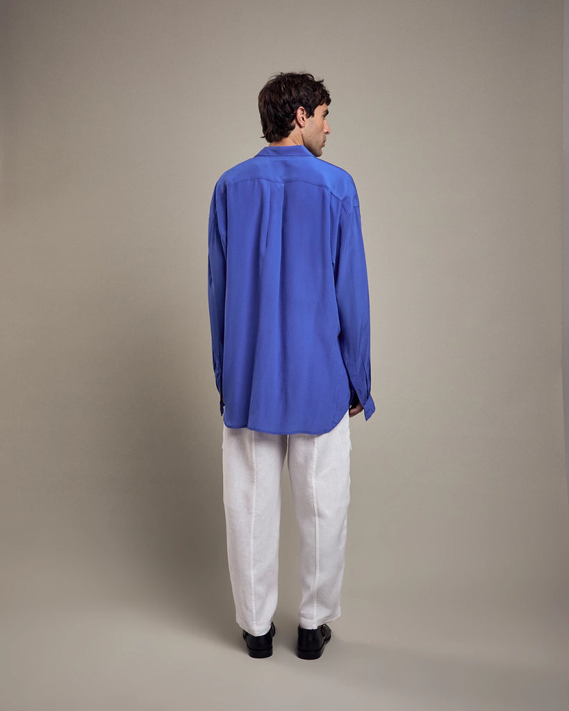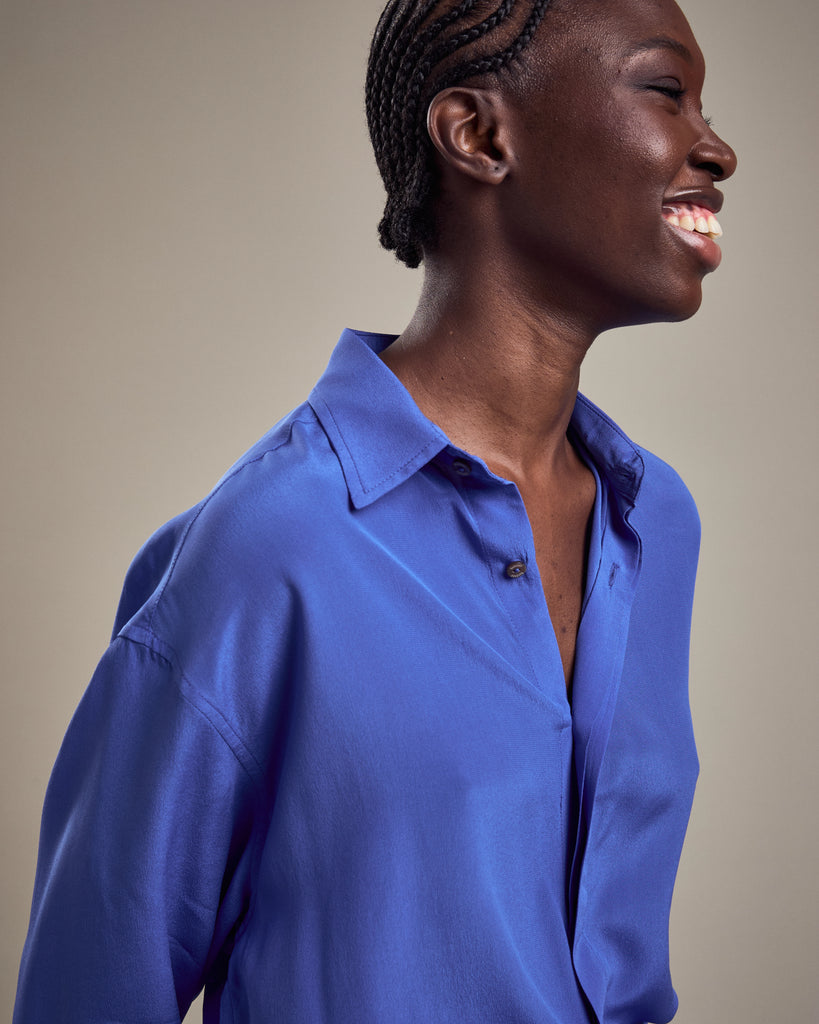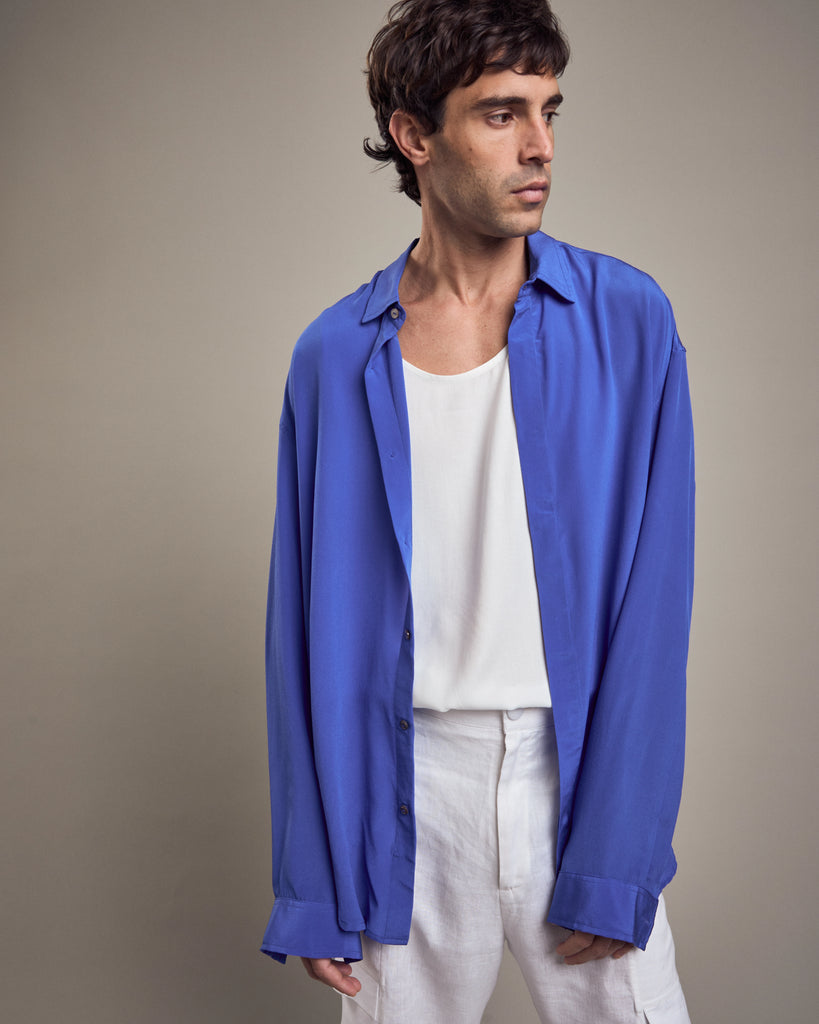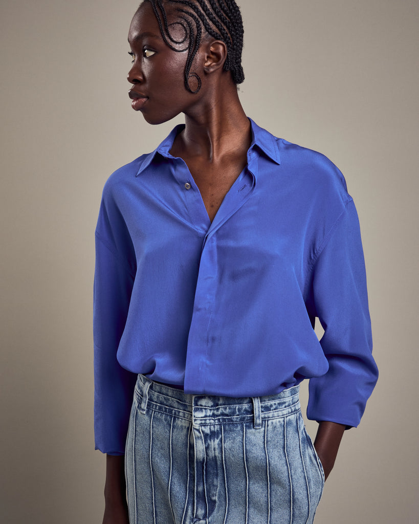 Camisa em seda, de modelagem ampla e mangas longas. Possui abotoamento frontal embutido e base arredondada.