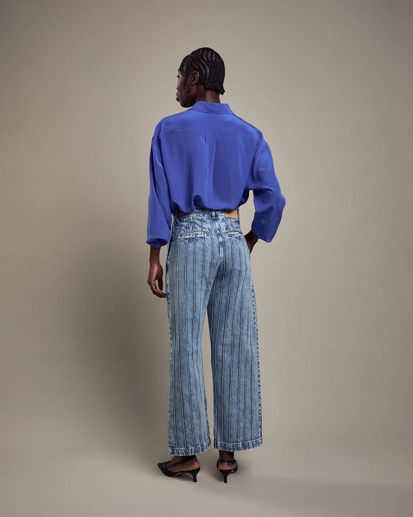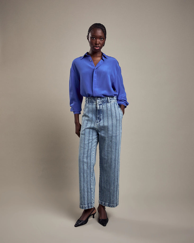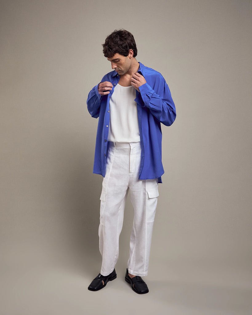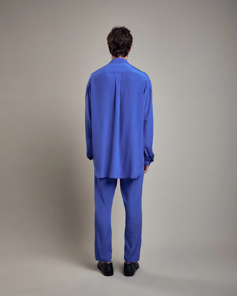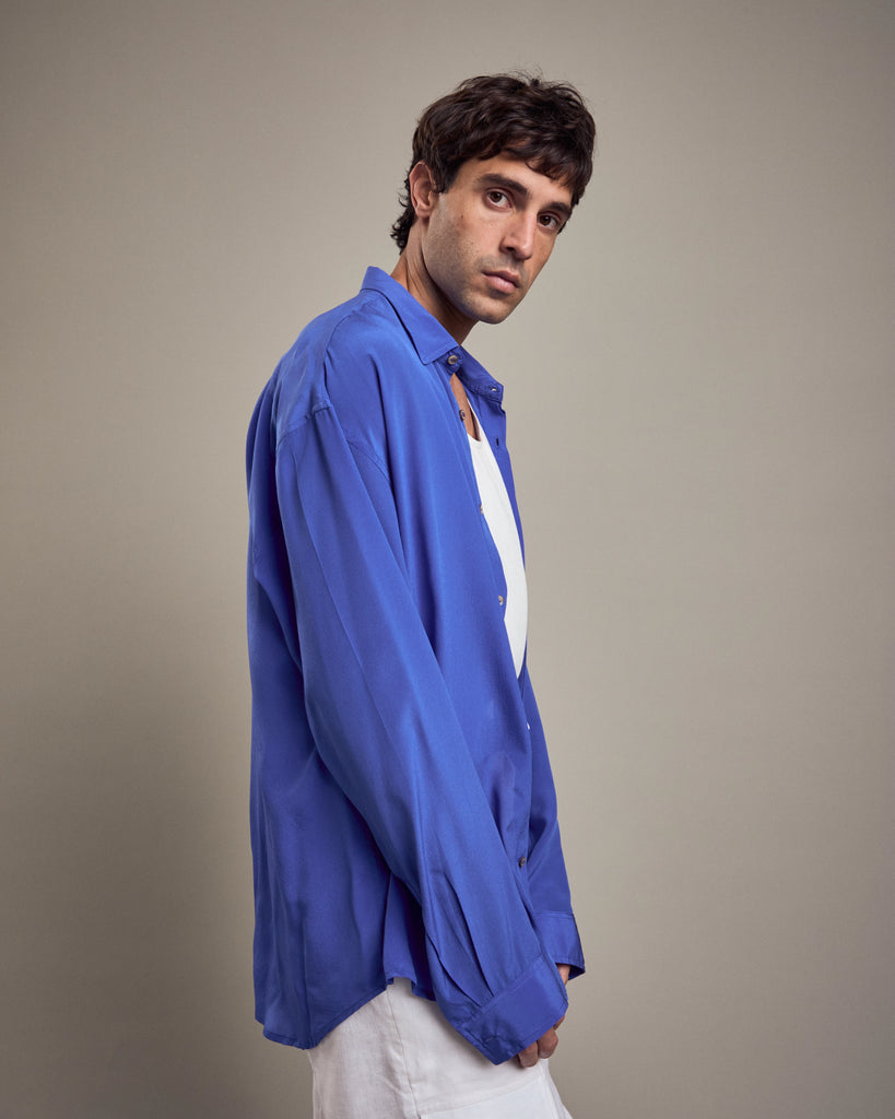 Camisa em seda, de modelagem ampla e mangas longas. Possui abotoamento frontal embutido e base arredondada.
