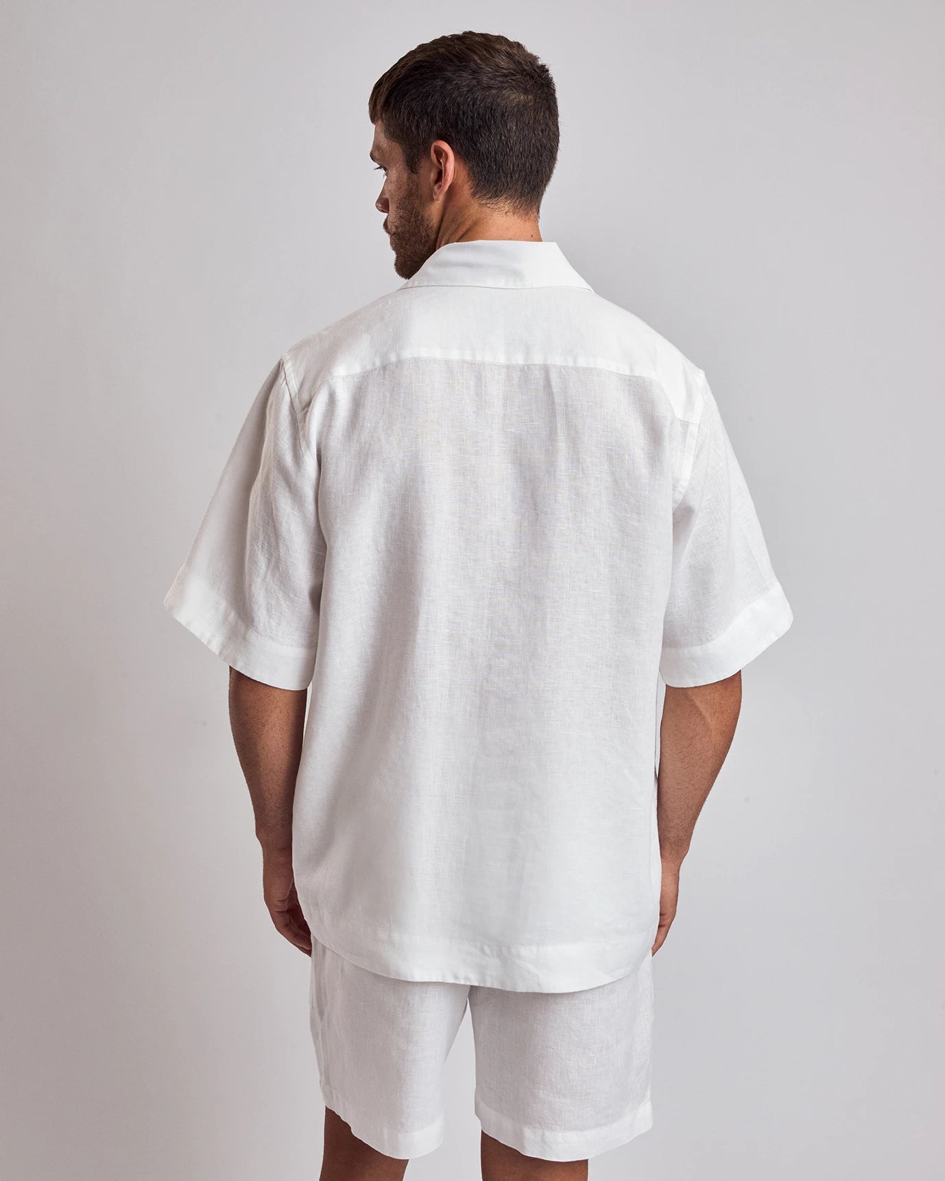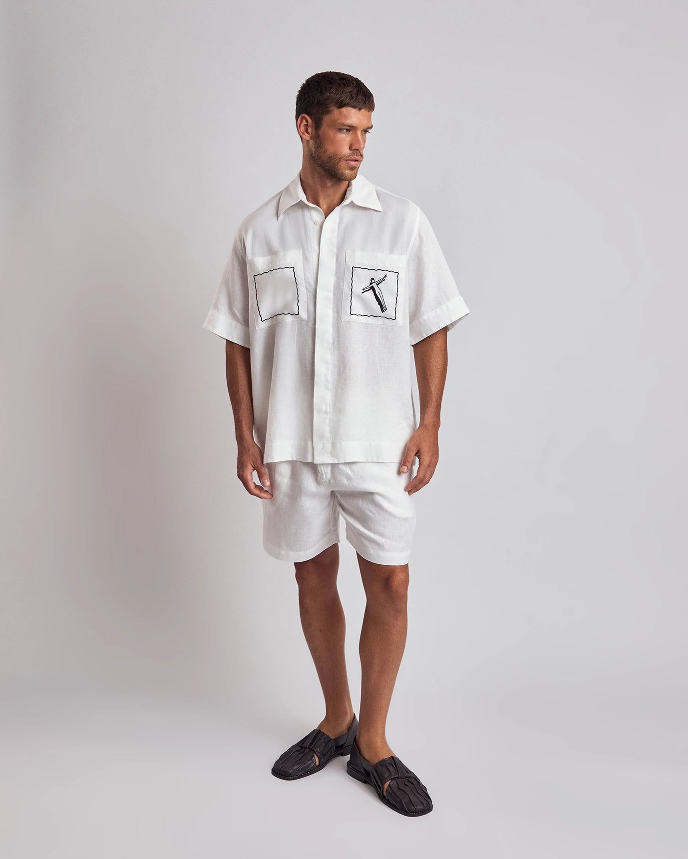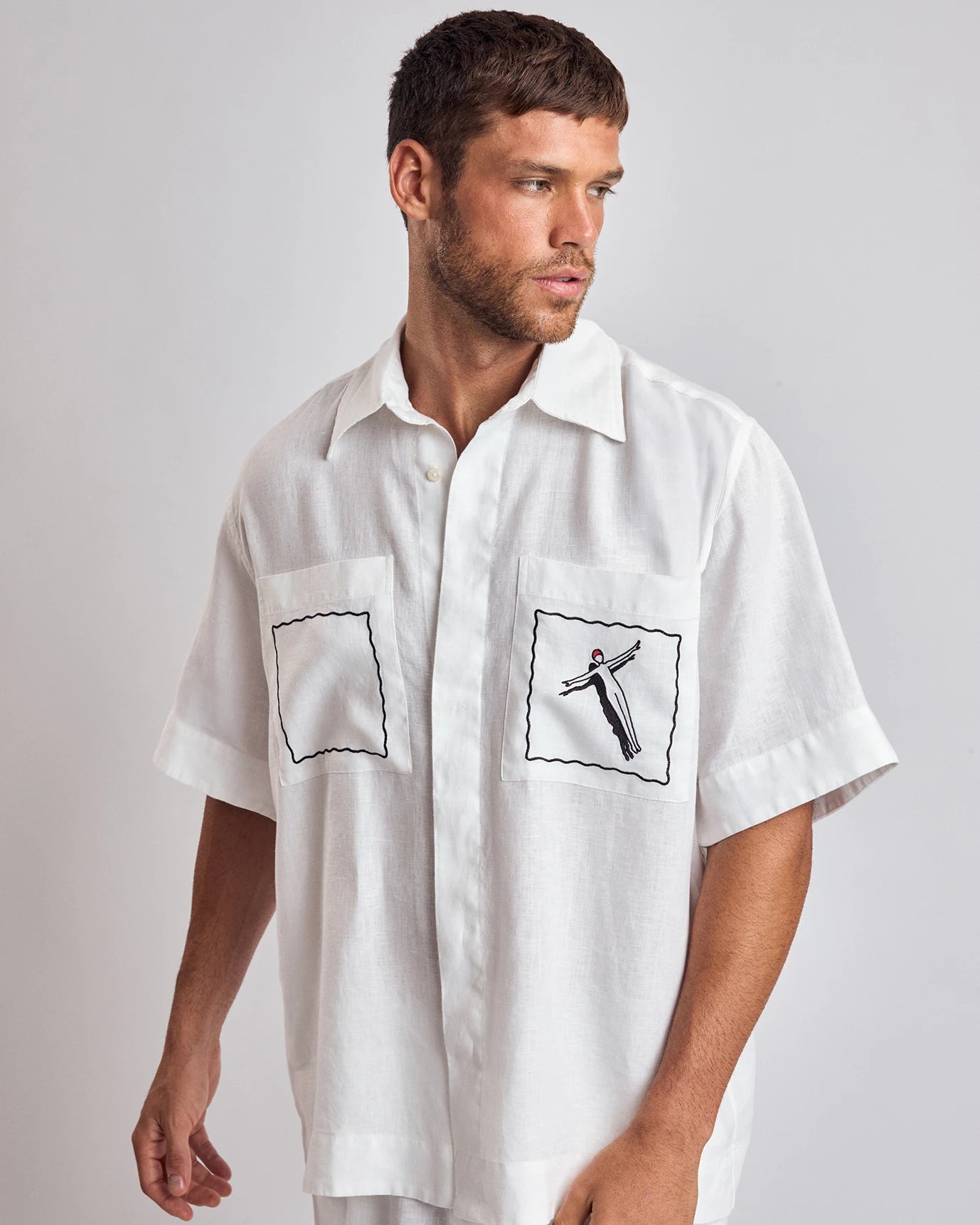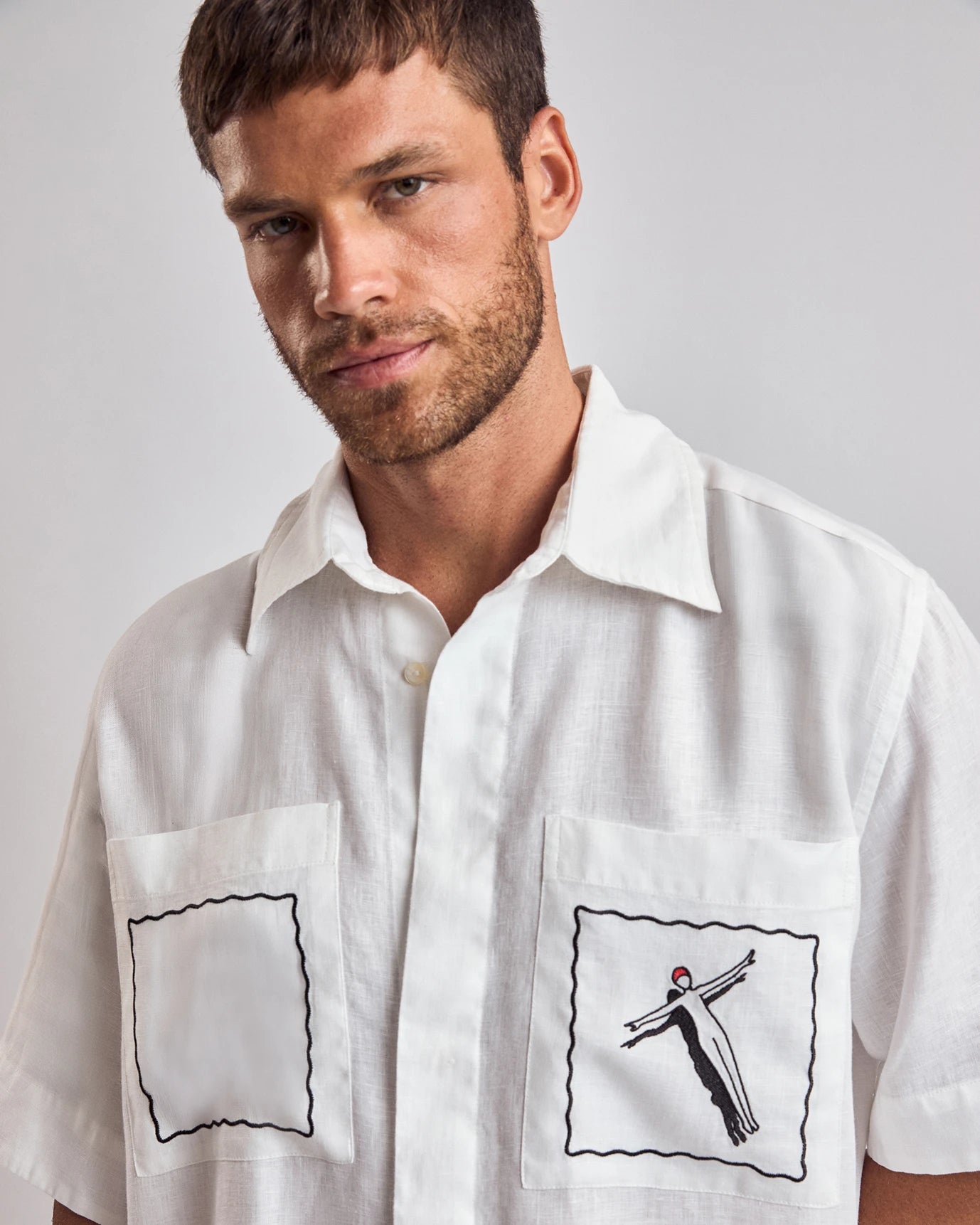 Camisa de linho com modelagem ampla e mangas curtas. Possui bordado localizado nos bolsos chapados e abotoamento frontal embutido.