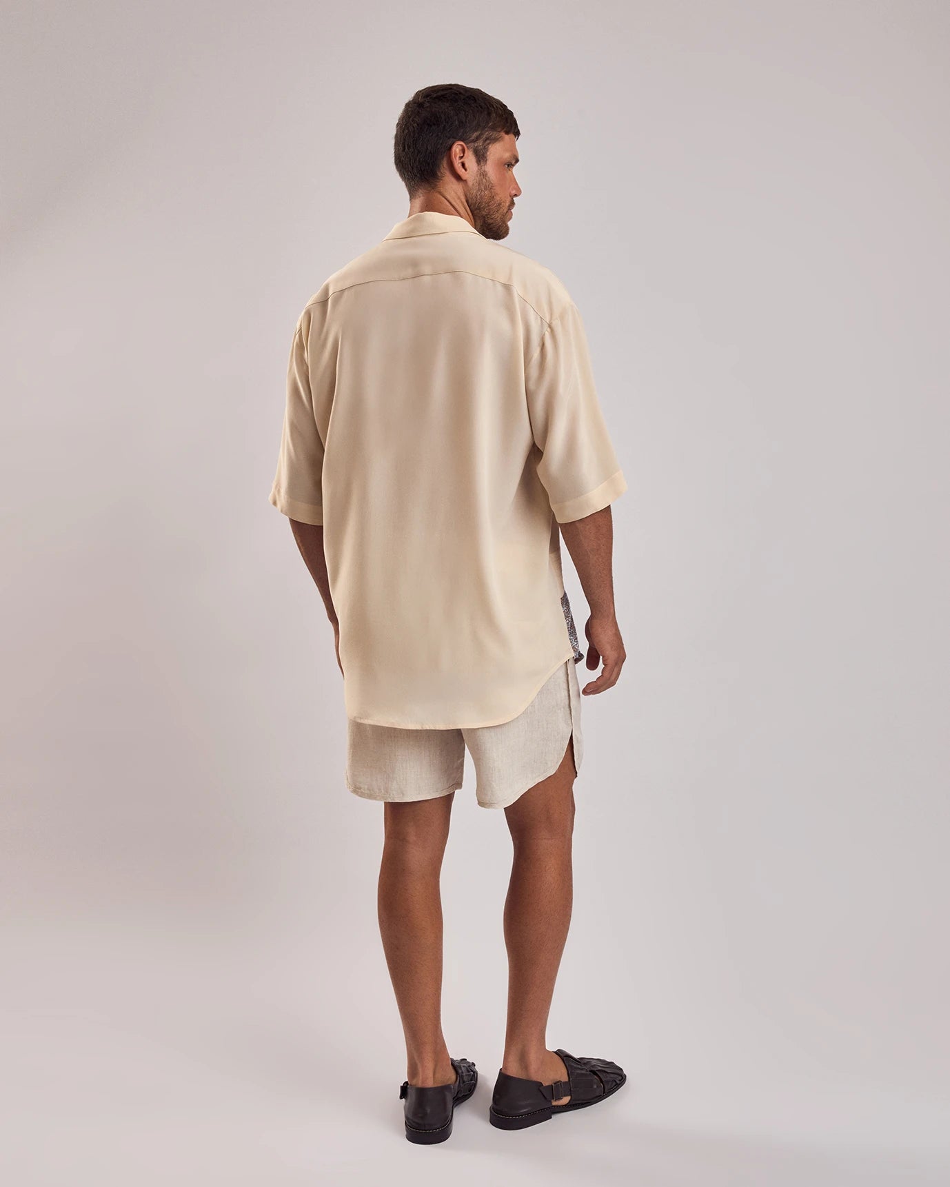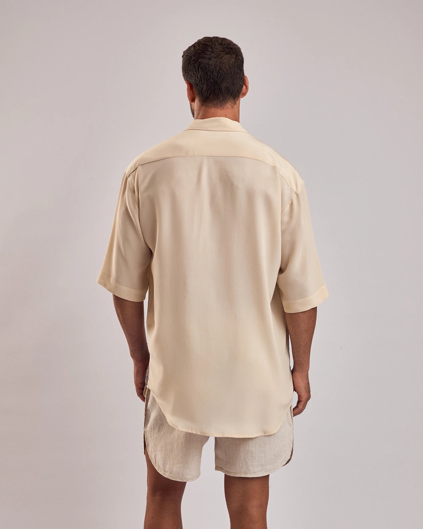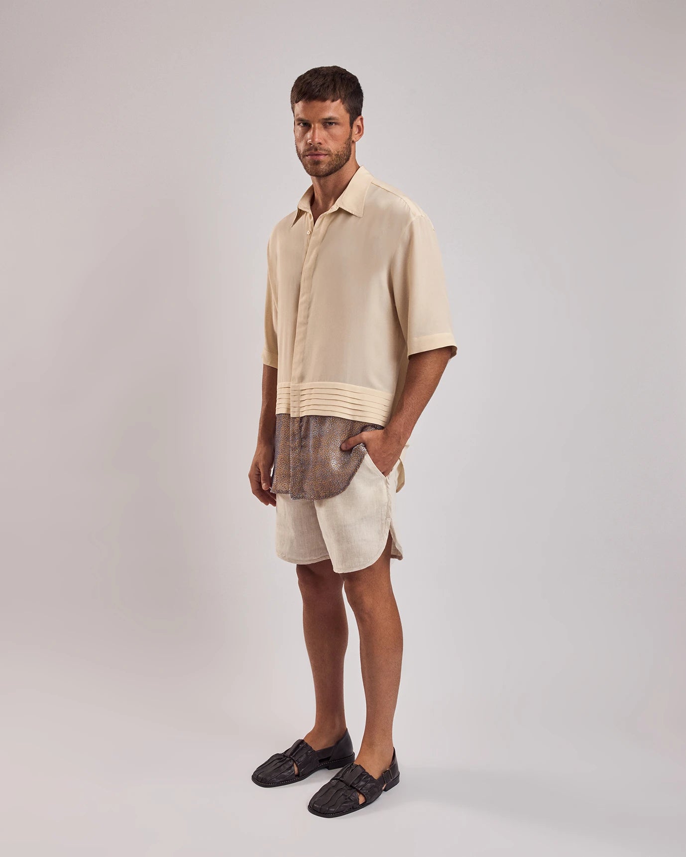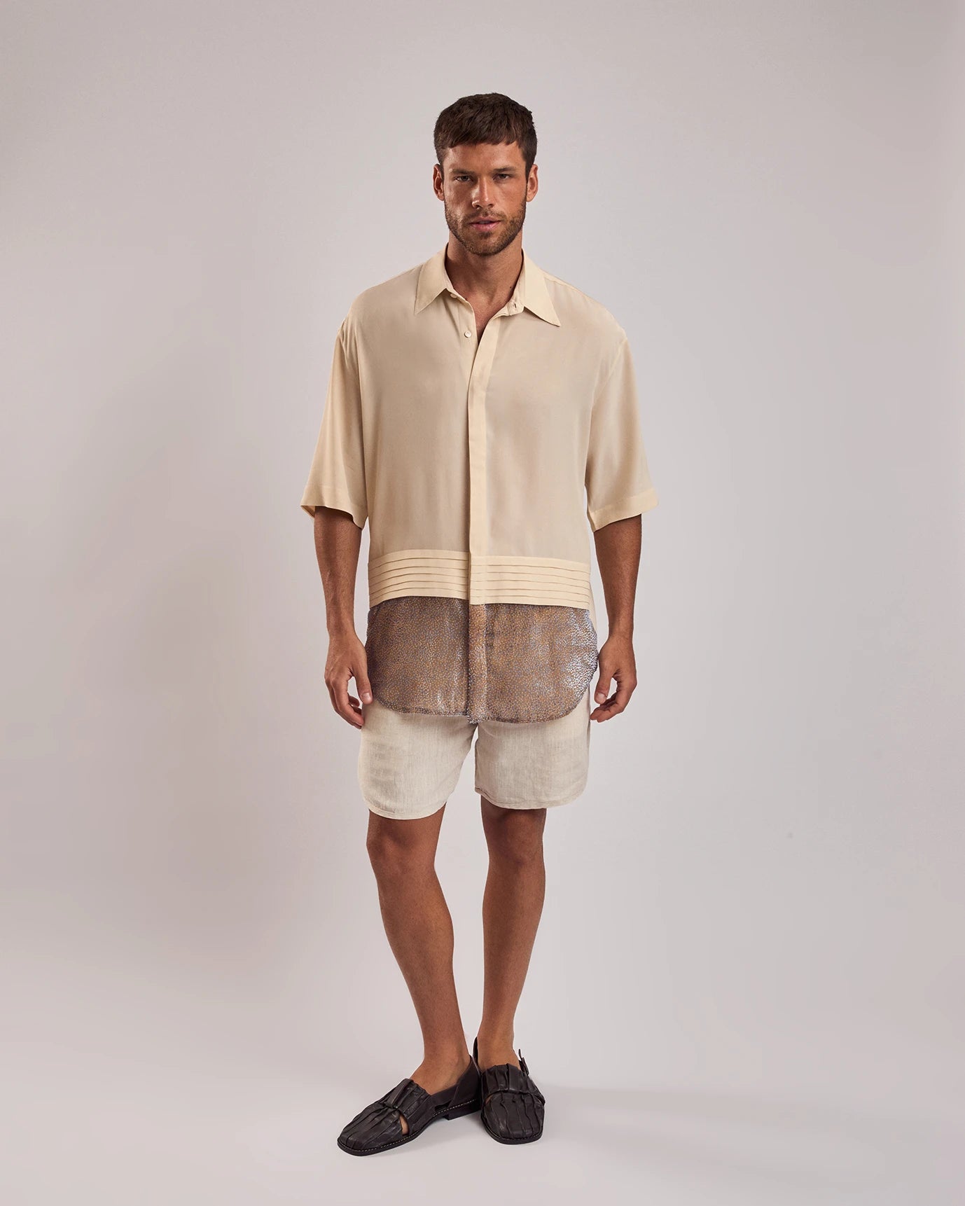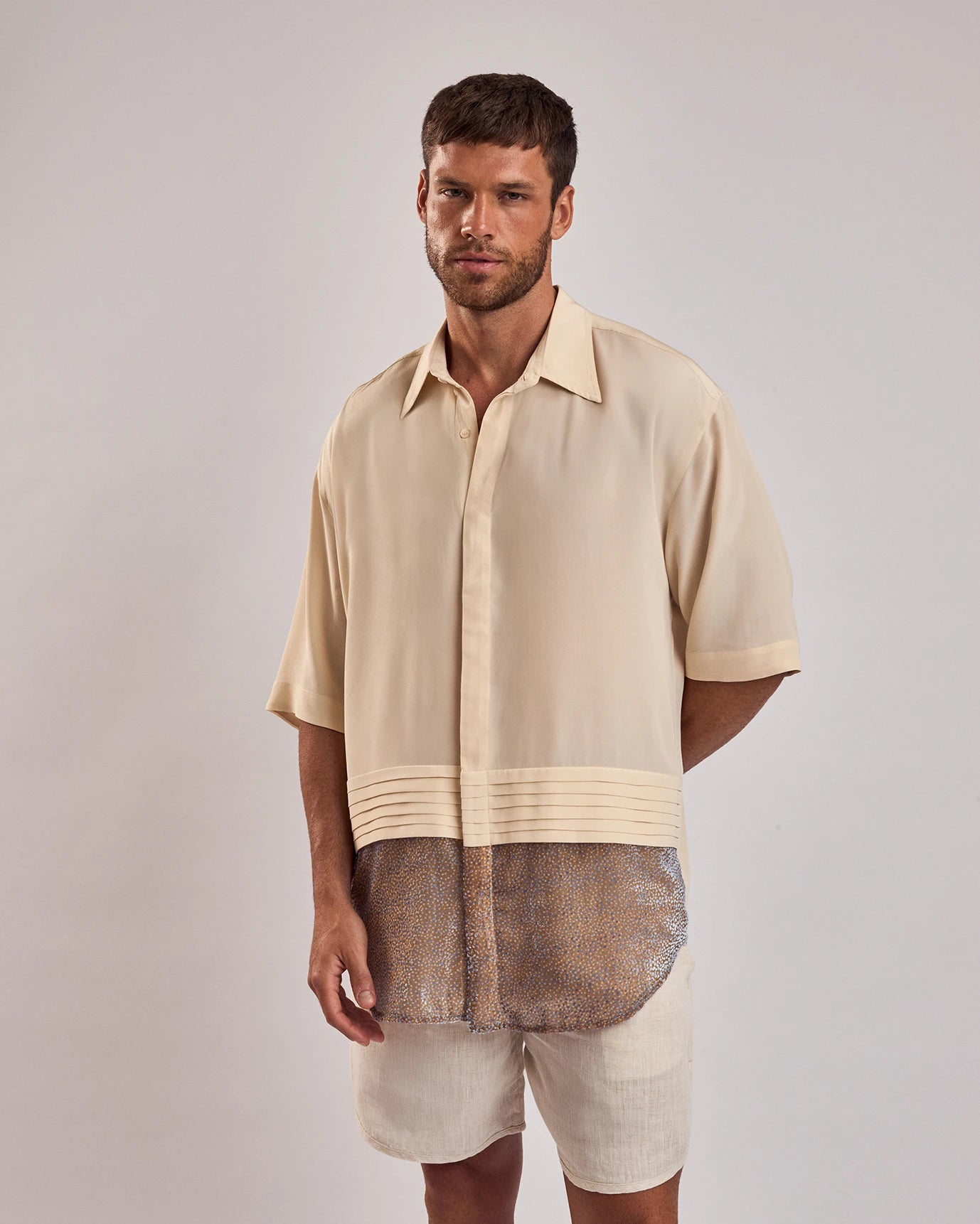 Camisa em seda, de modelagem ampla. Apresenta preguinhas seguidas por um recorte no veludo devorê na parte inferior da frente. Possui mangas curtas, abotoamento frontal embutido e base arredondada.