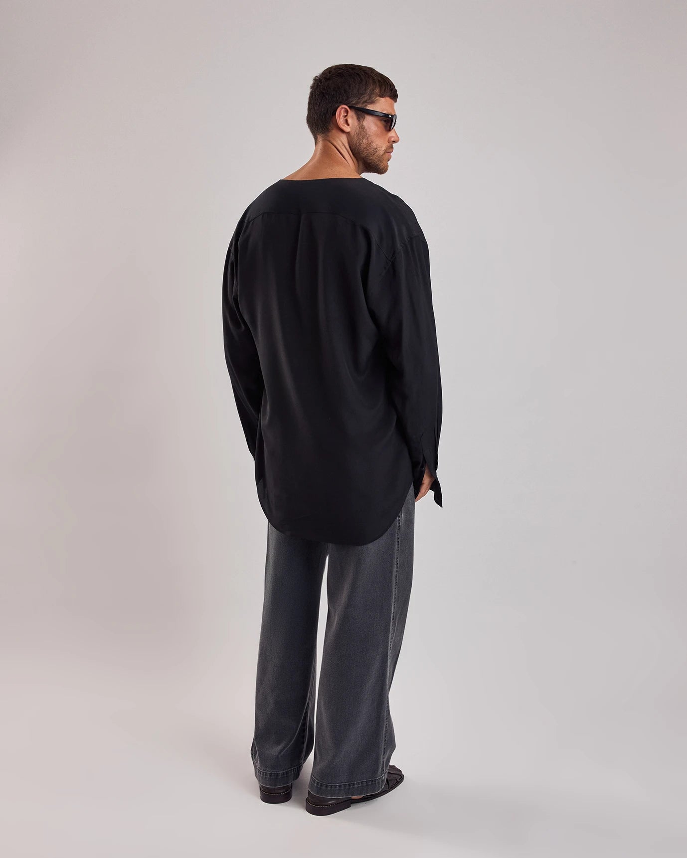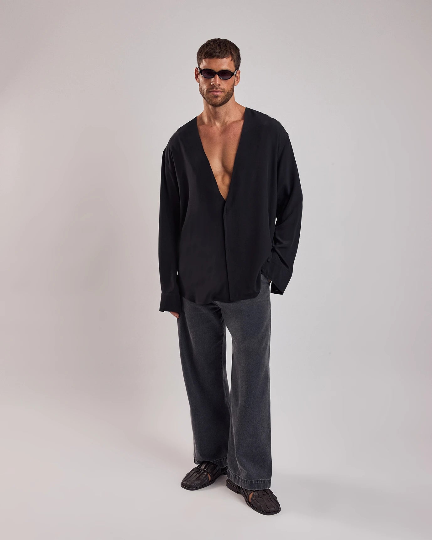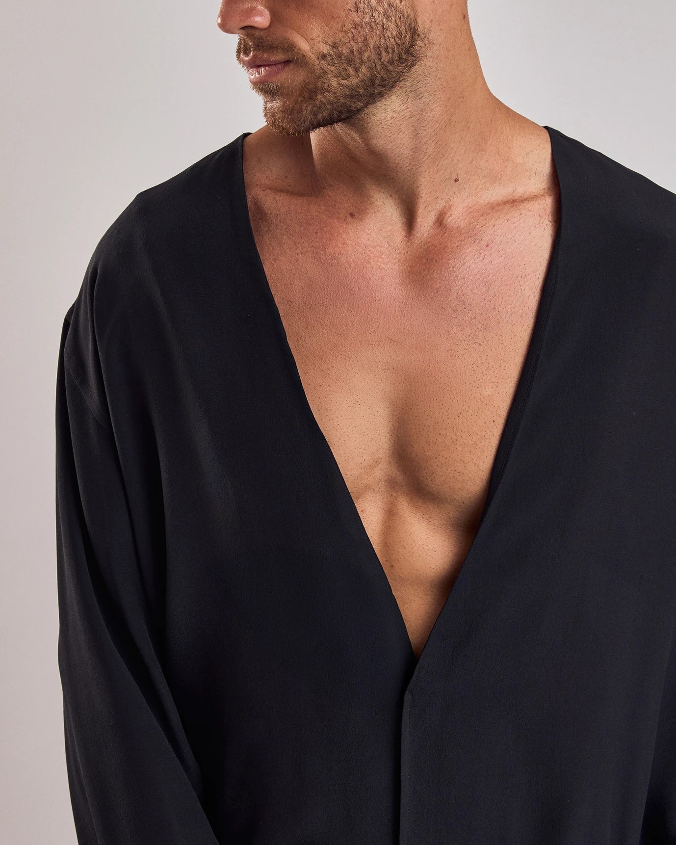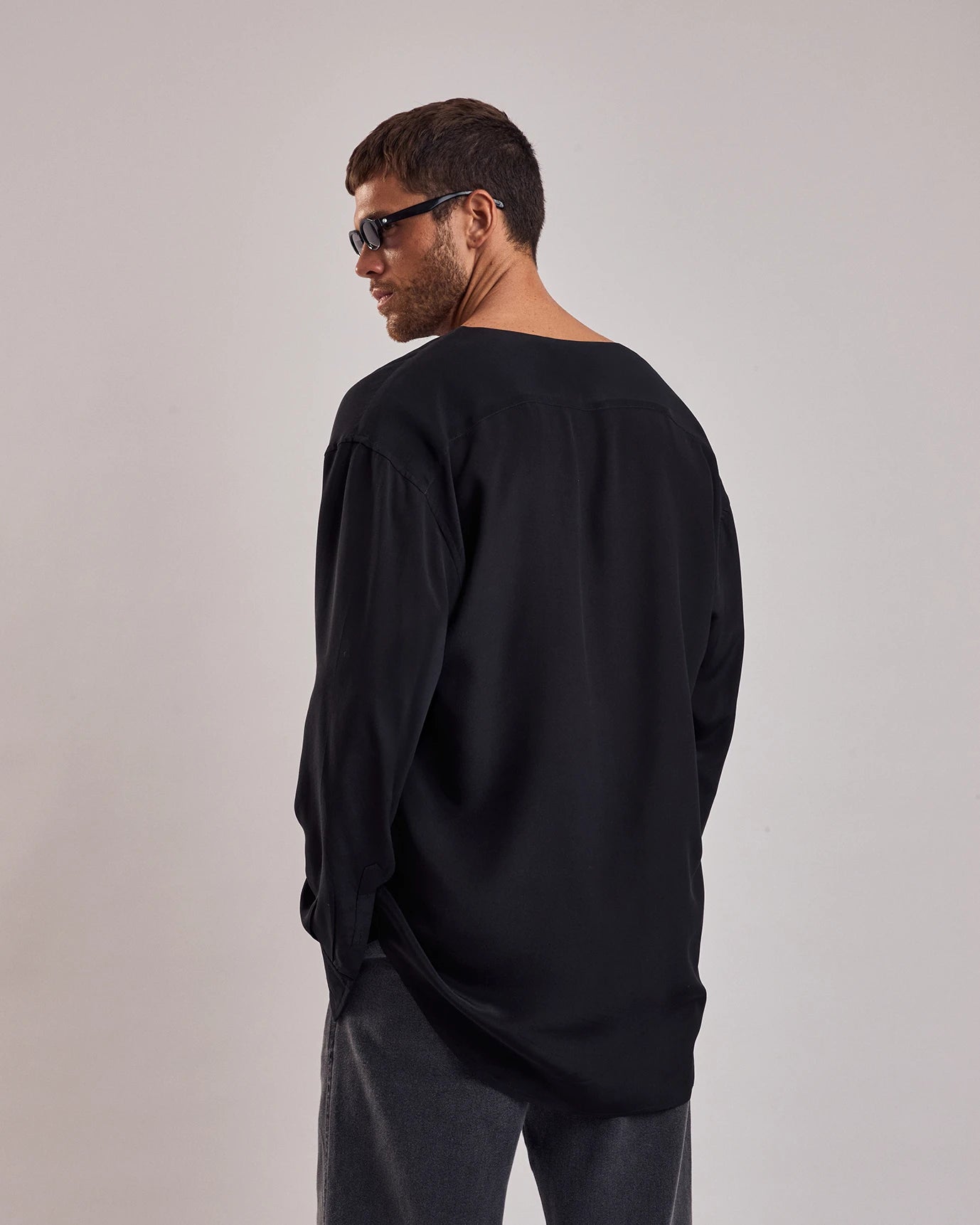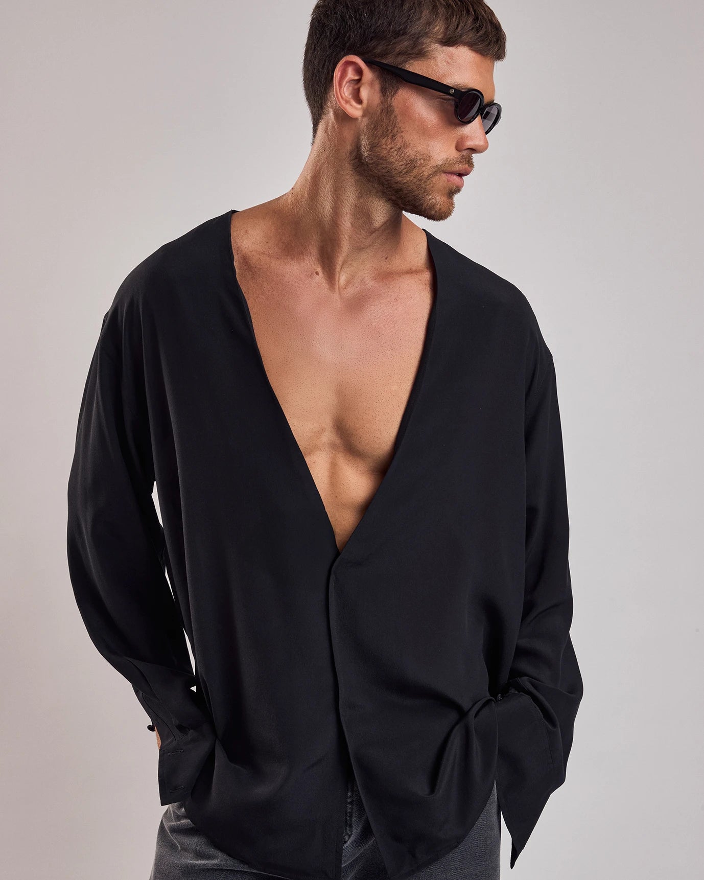 Camisa em seda, de modelagem ampla com decote v profundo. Possui mangas longas e abotoamento interno.
