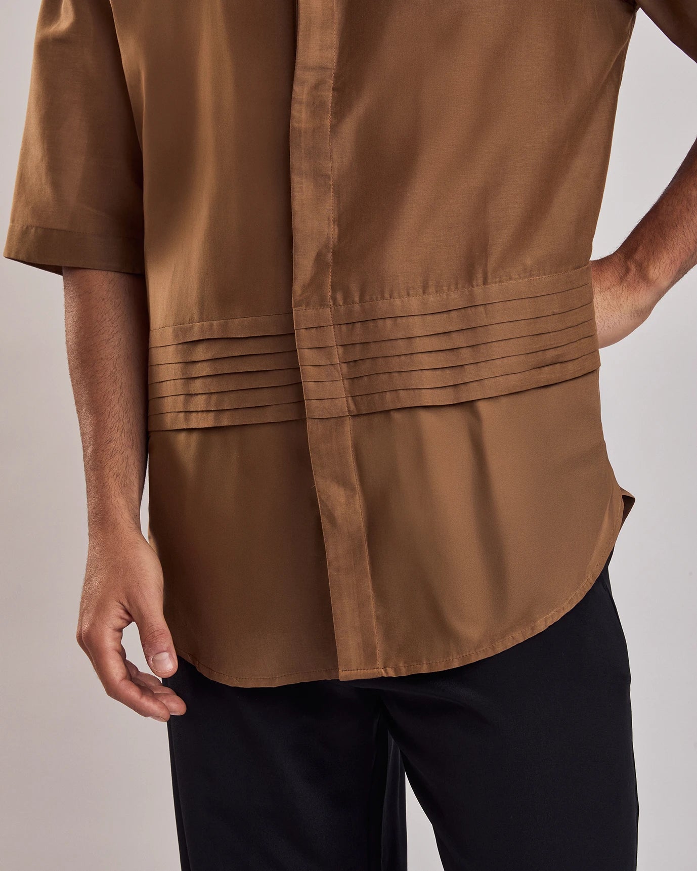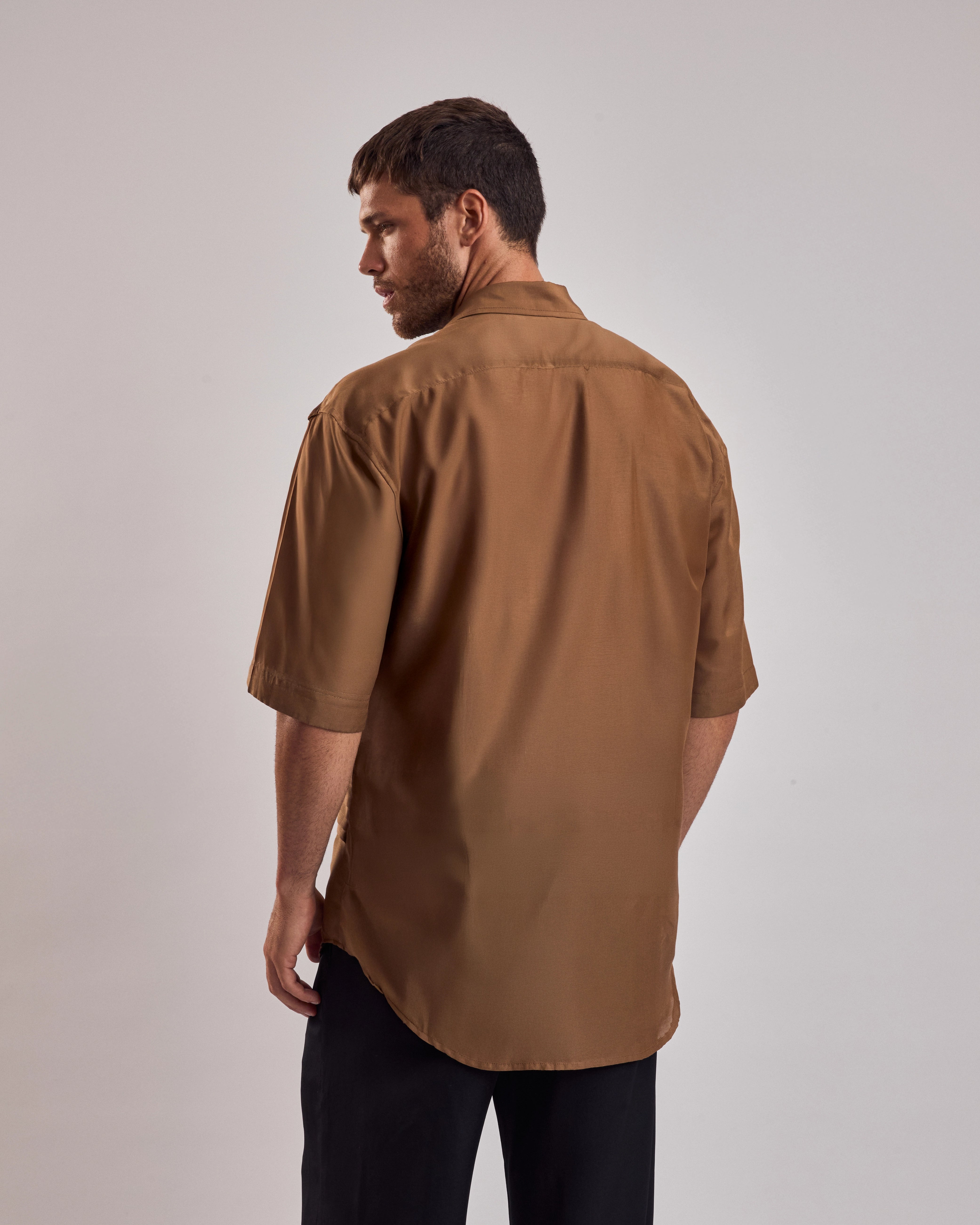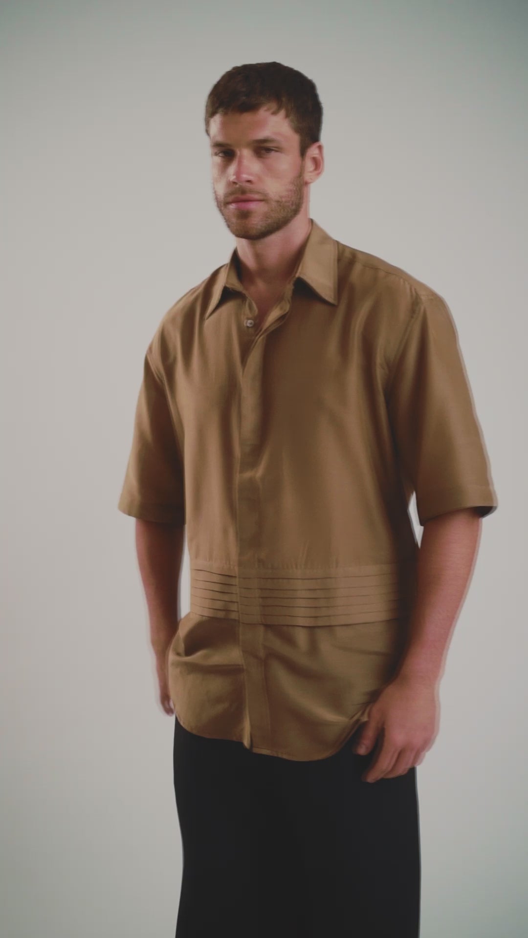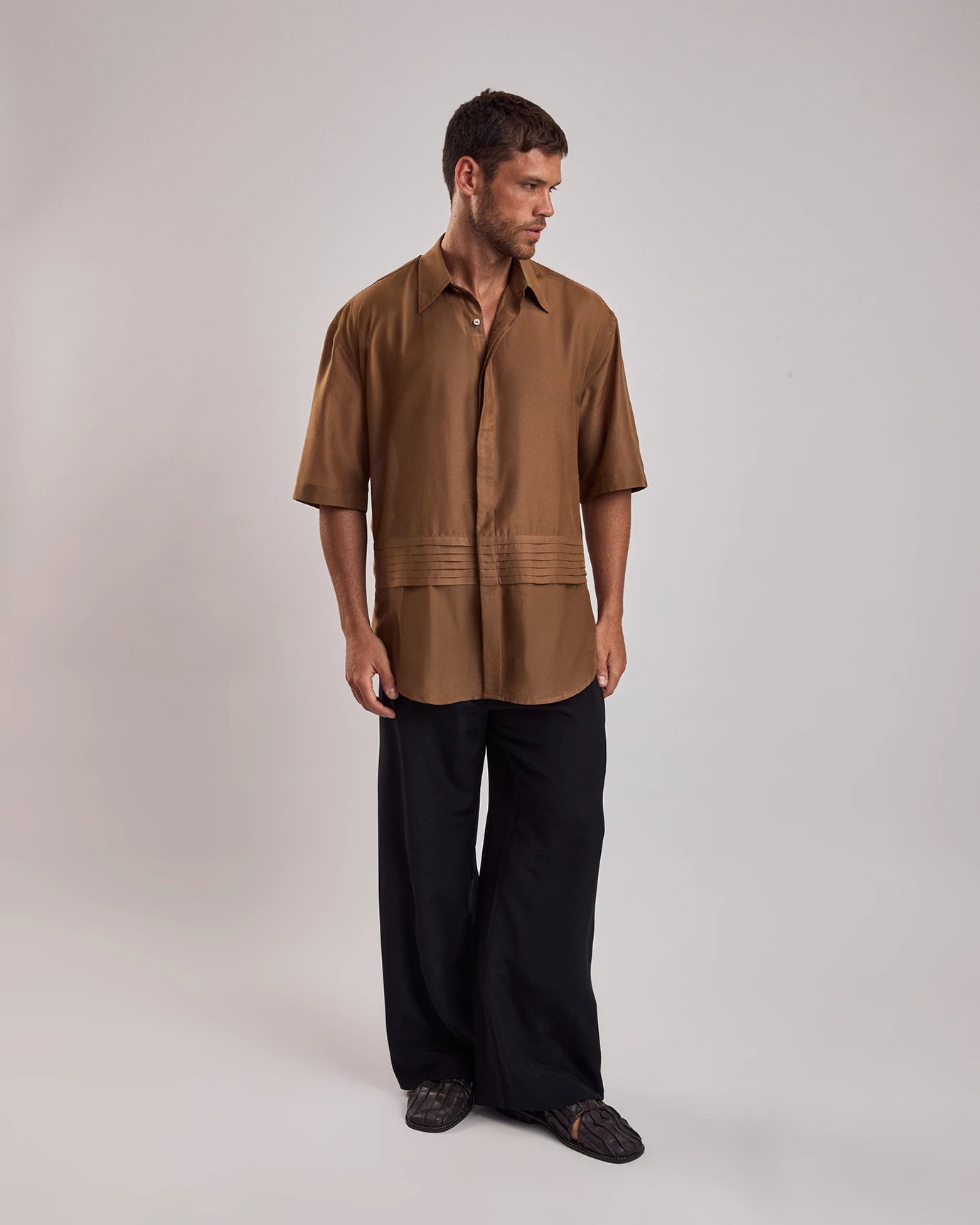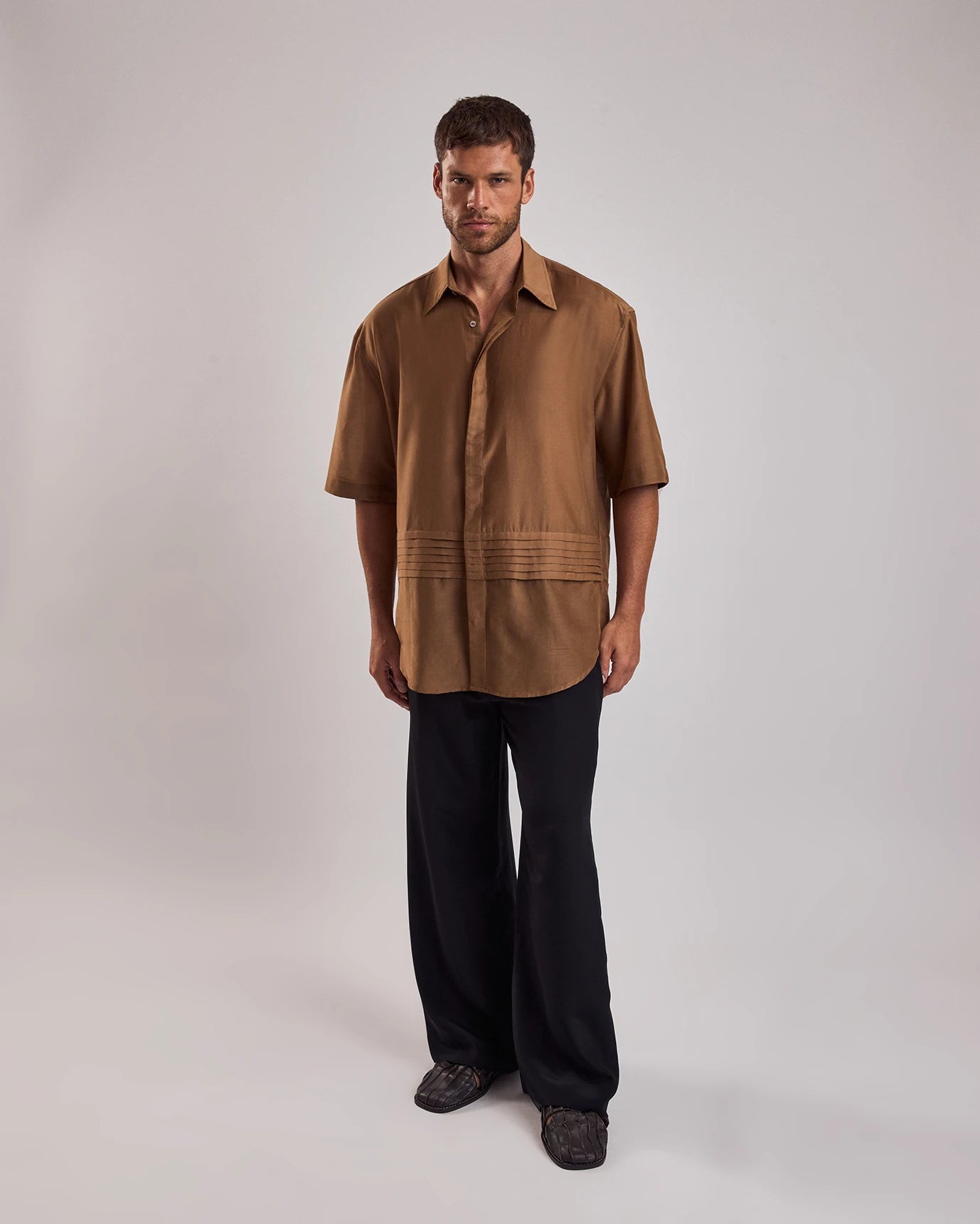 Camisa em voil de algodão com seda, de modelagem ampla. Apresenta preguinhas na frente. Possui mangas curtas, abotoamento frontal embutido e base arredondada.