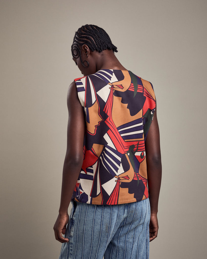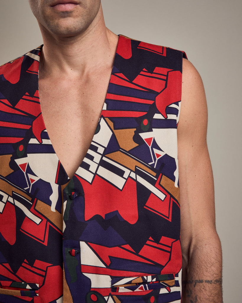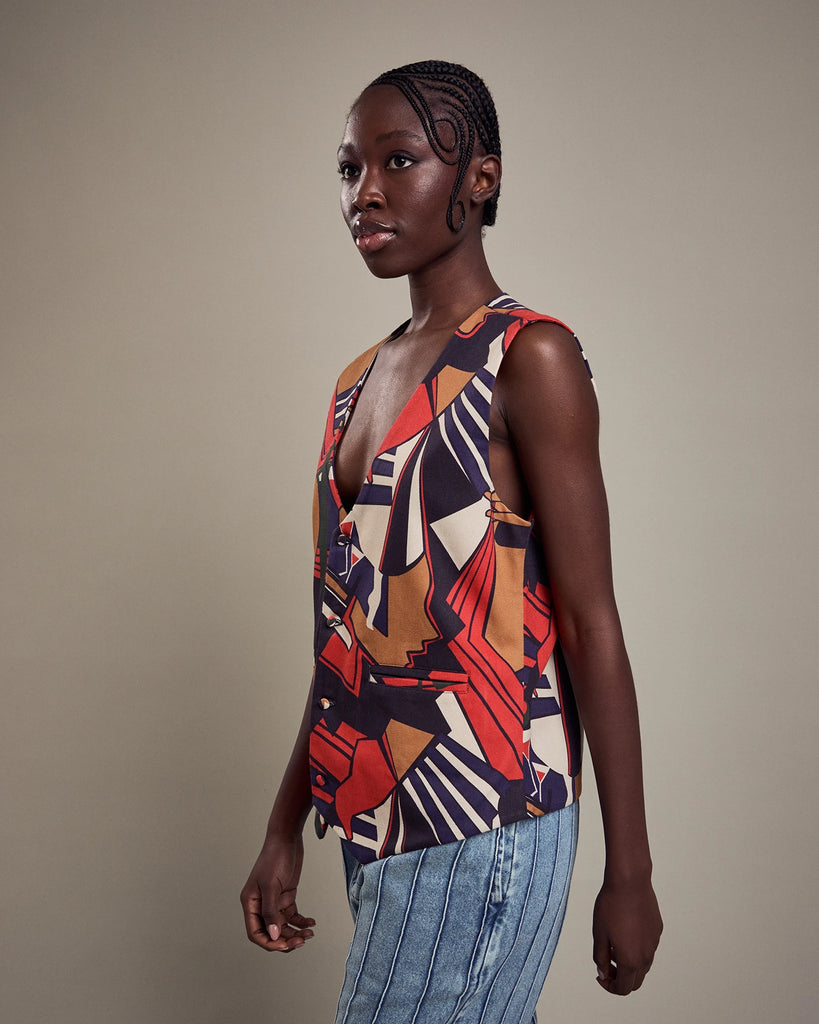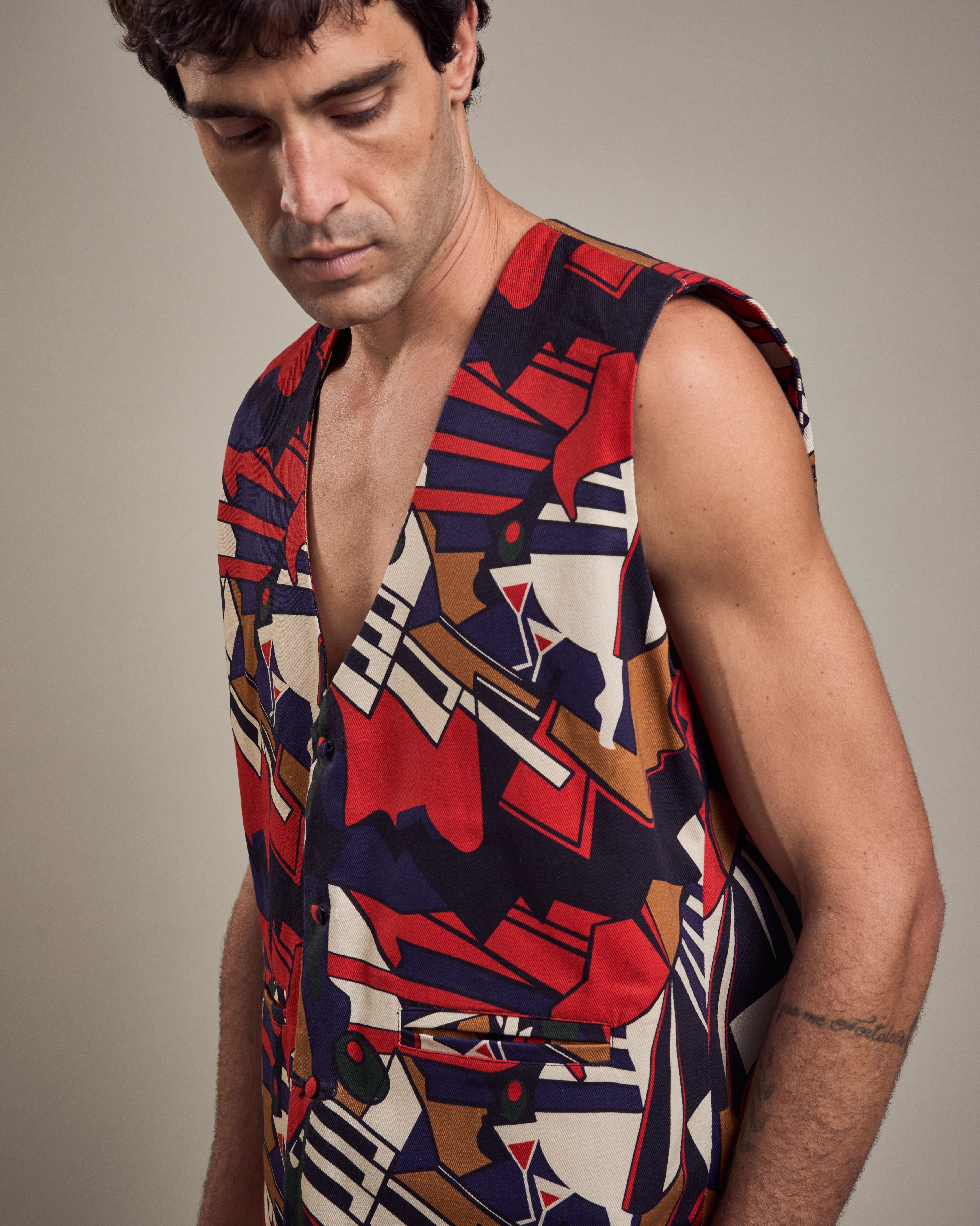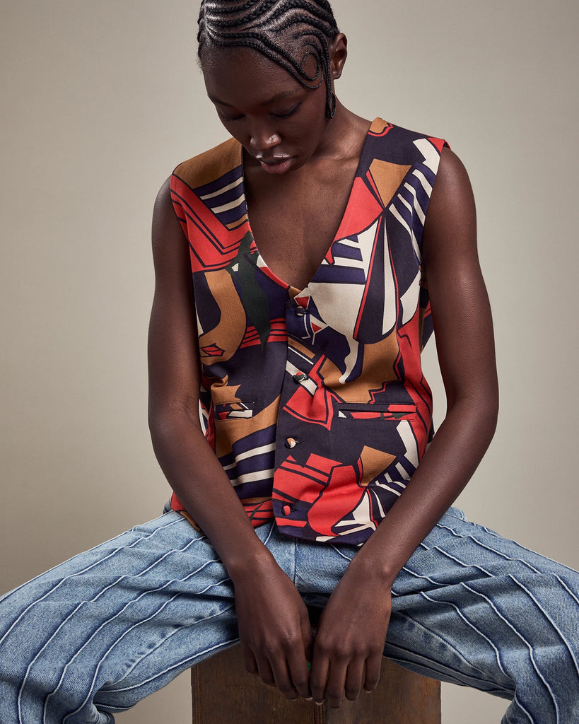 Colete de sarja com fechamento por botões forrados e bolso embutido na frente.