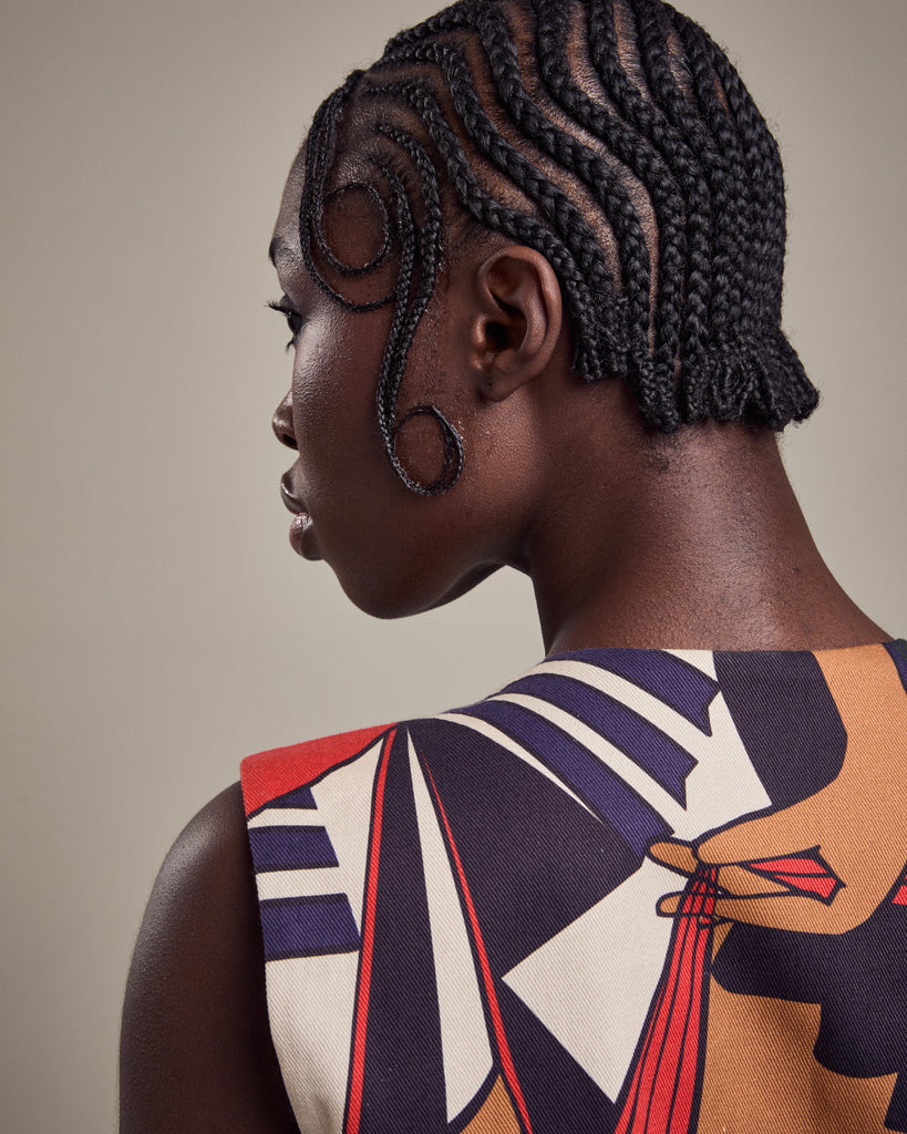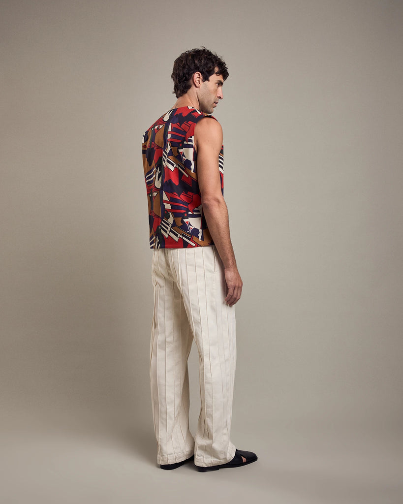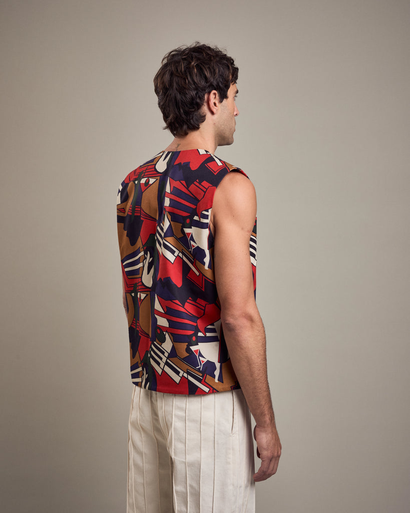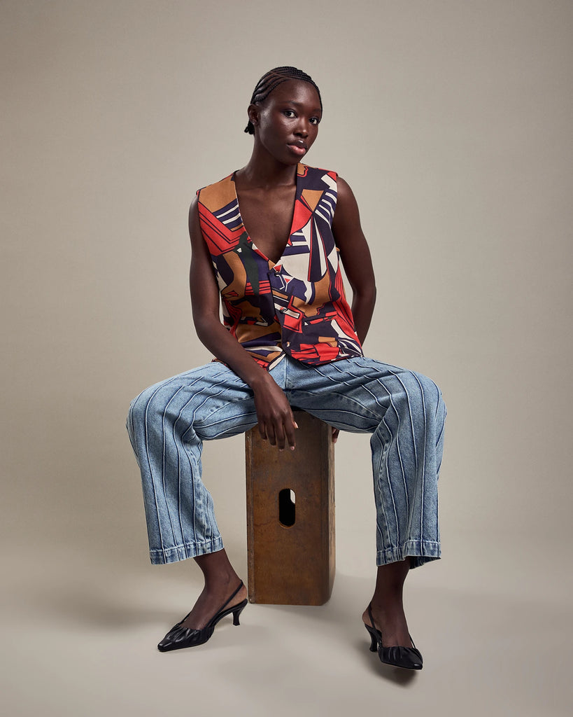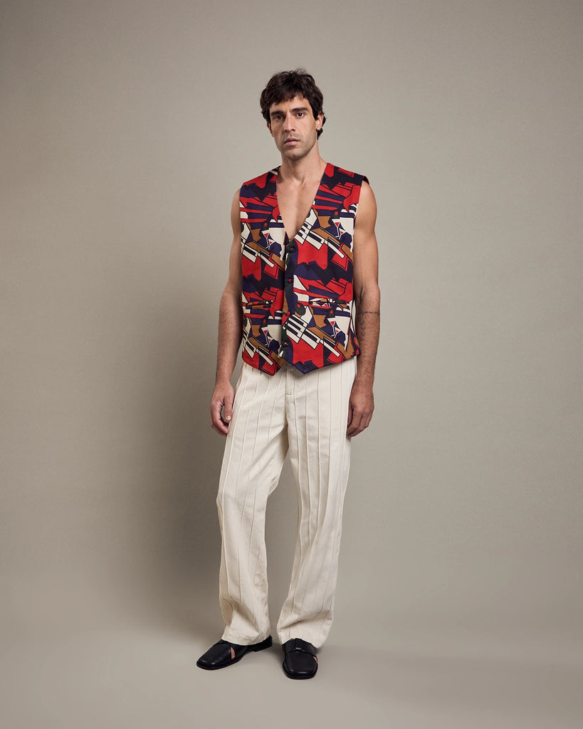 Colete de sarja com fechamento por botões forrados e bolso embutido na frente.