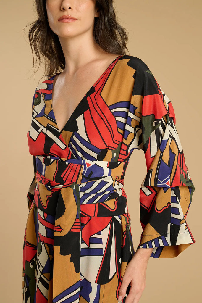 Túnica tipo quimono em seda, com transpasse frontal e amarração solta estilo obi. Possui mangas 7/8 com pregas, botão forrado para fechamento e fendas laterais.