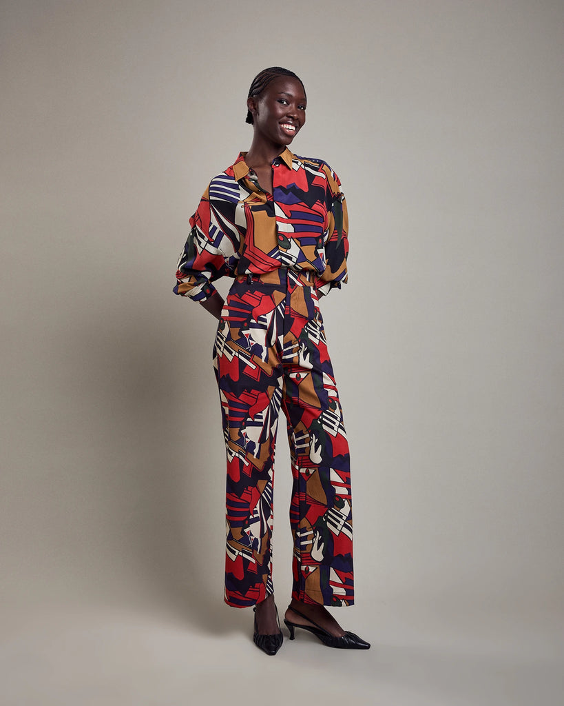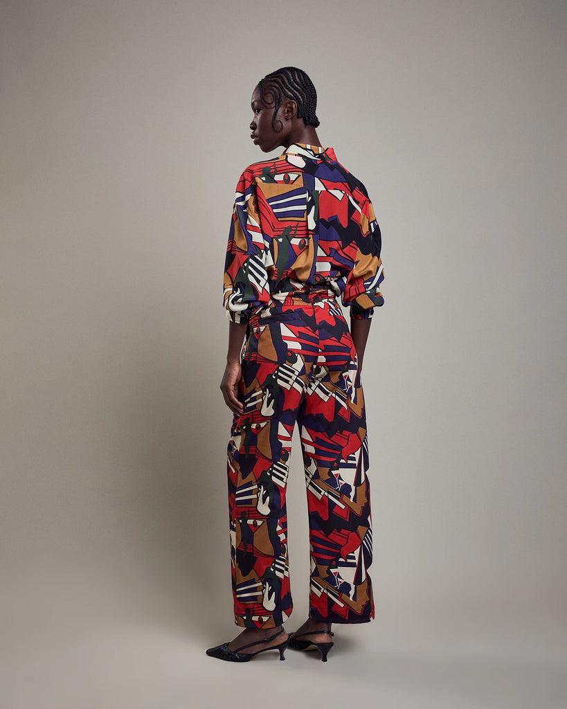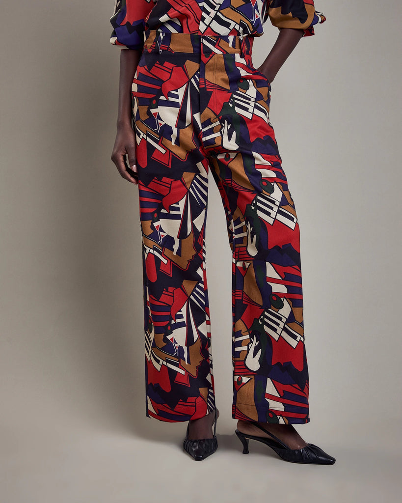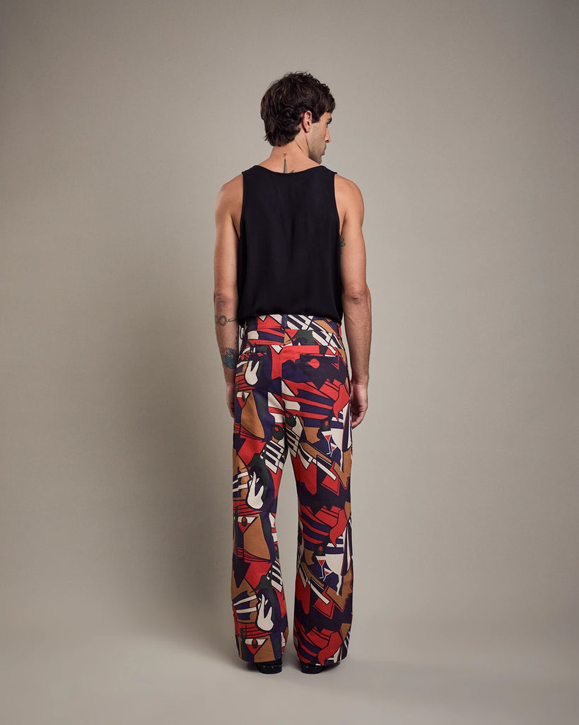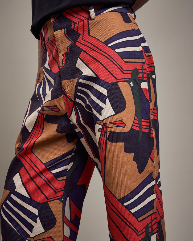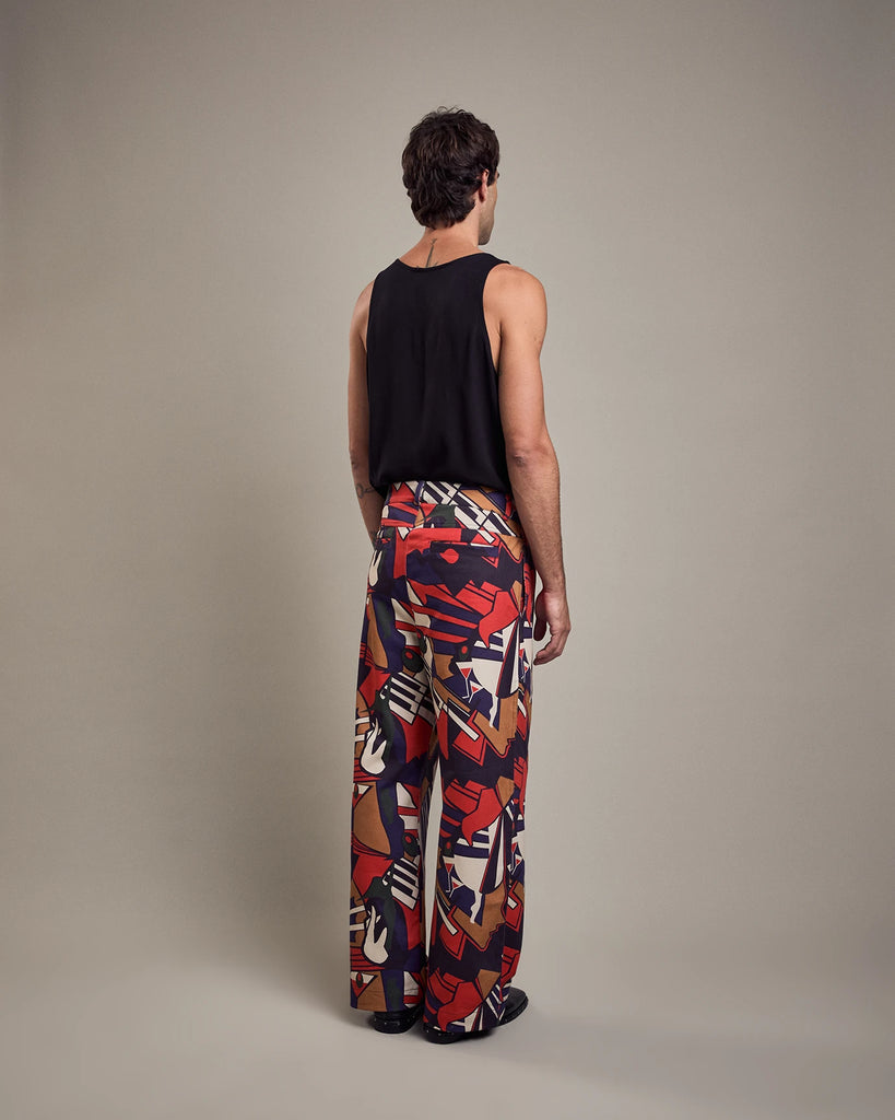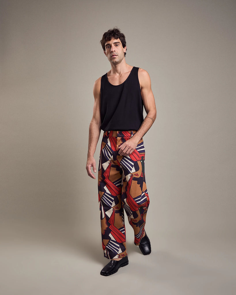 Calça sarja ampla, com pala larga. Possui fechamento interno por ganchos, passantes no cós, bolsos faca nas laterais e bolso embutido na parte traseira.