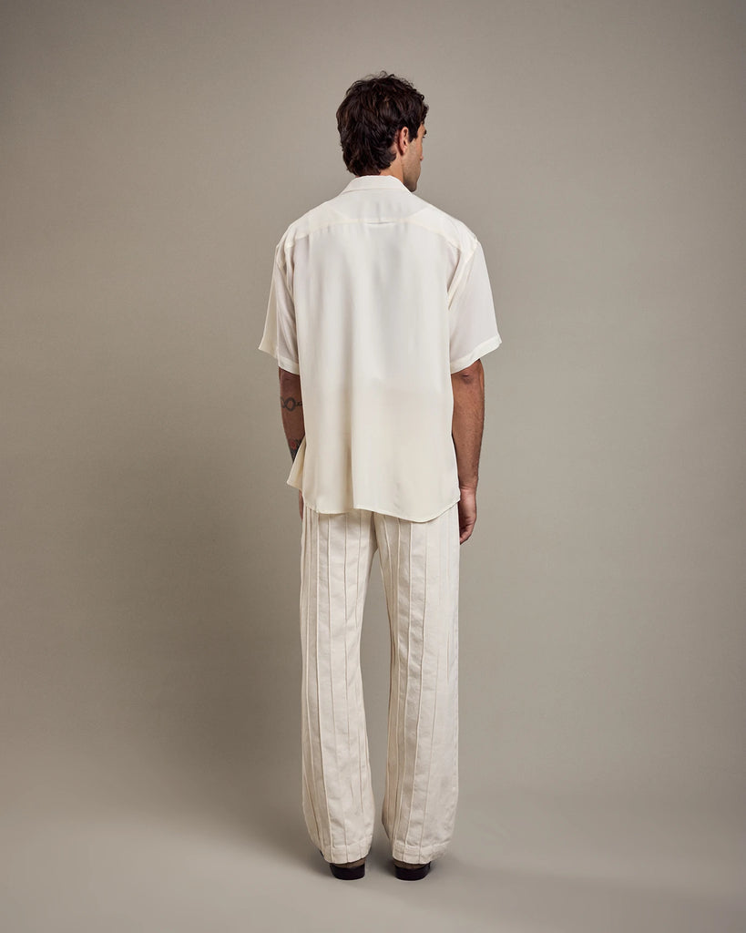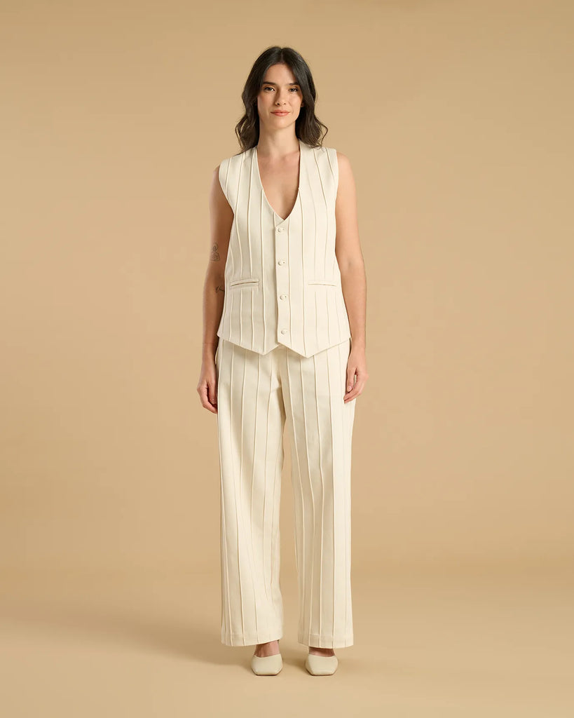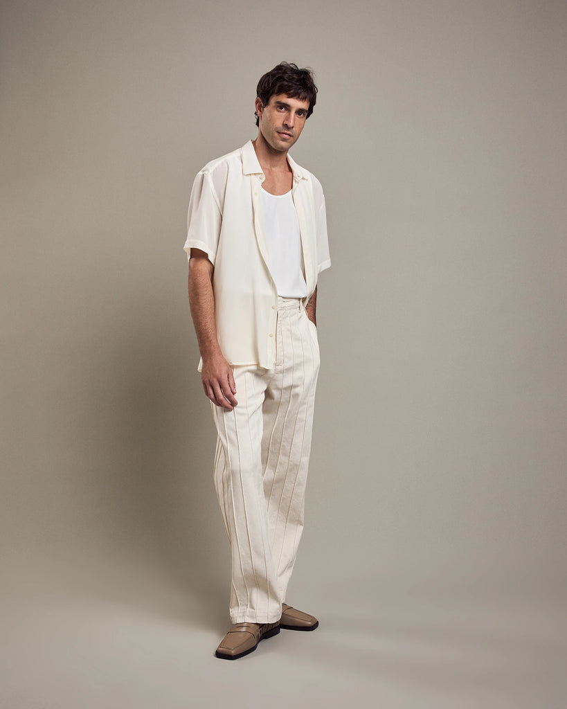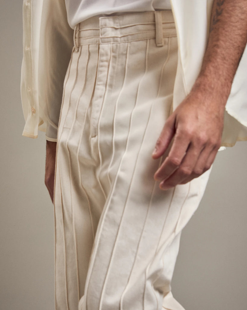 Calça jeans reta com vincos verticais ao longo da peça. Possui fechamento interno por ganchos, passantes, bolsos faca nas laterais e bolso embutido na parte traseira.