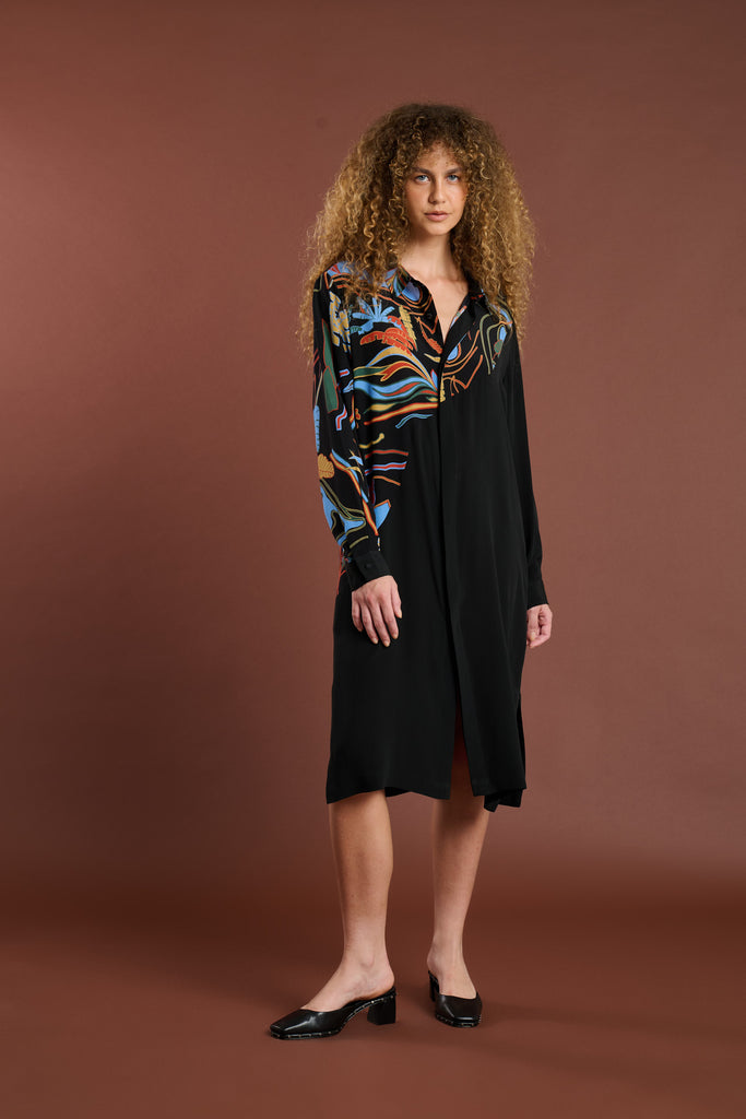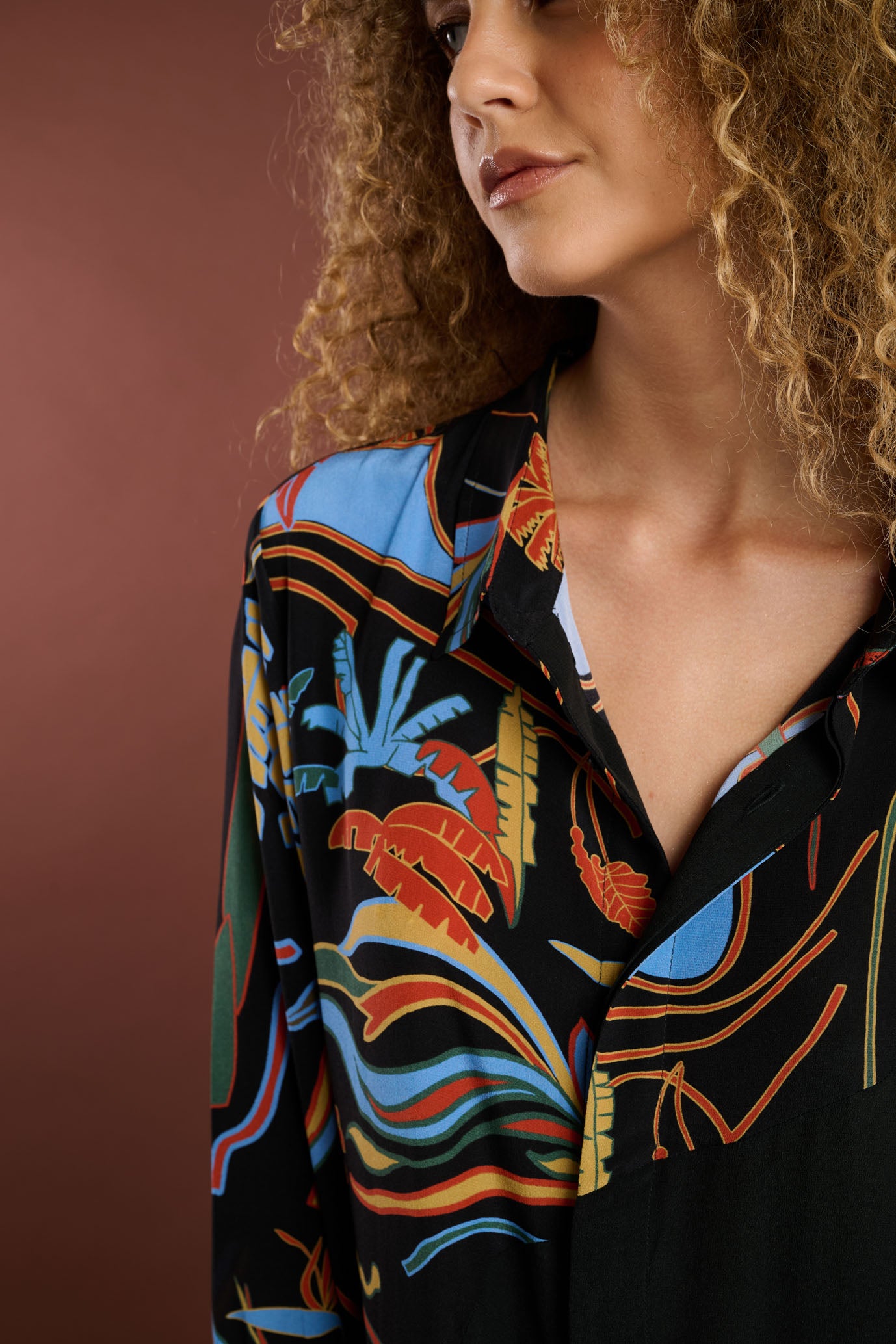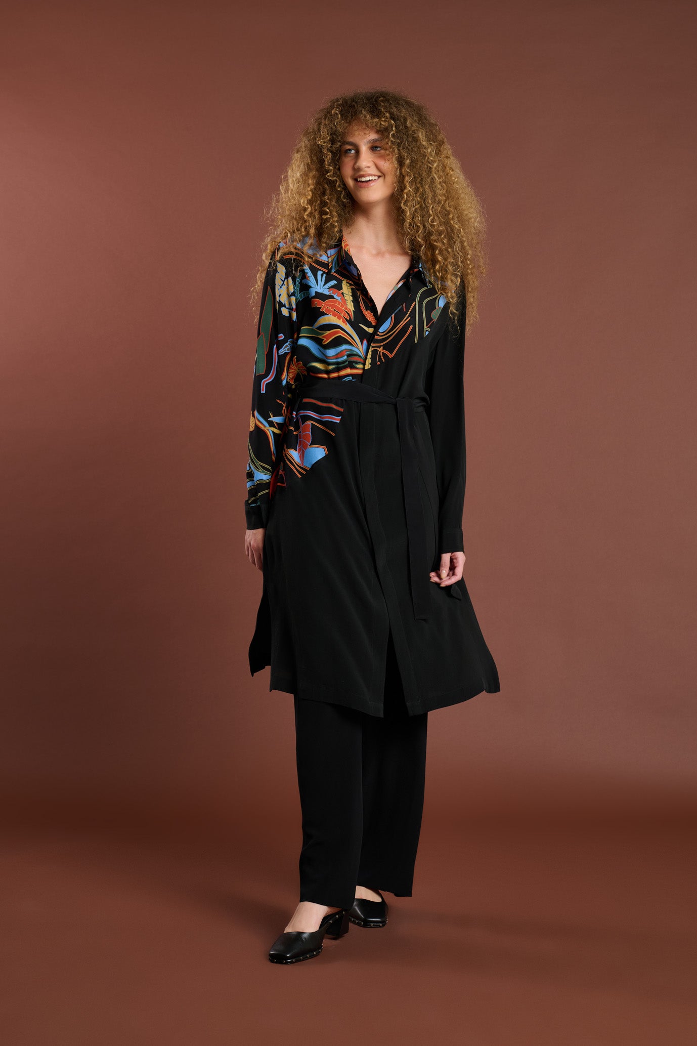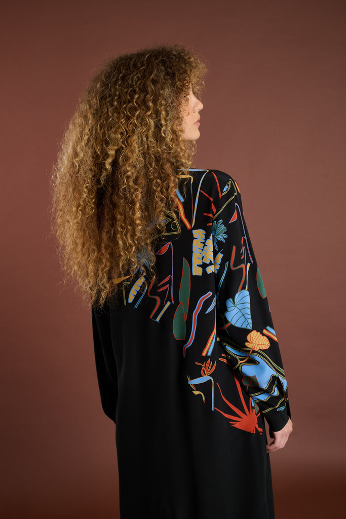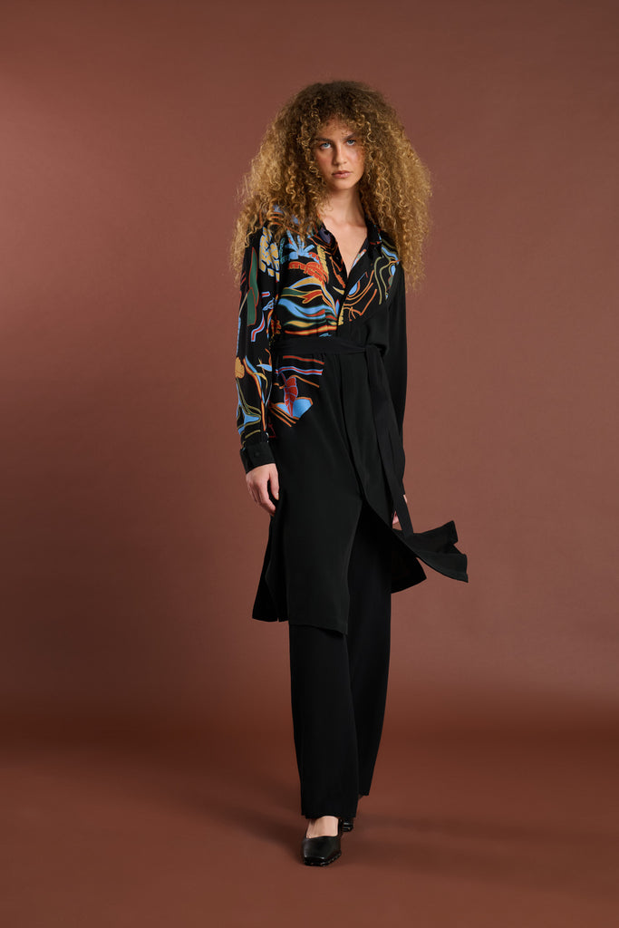Chemise de seda com modelagem ampla, manga longa, ombros deslocados, abotoamento frontal embutido, bolso e fendas nas laterais.