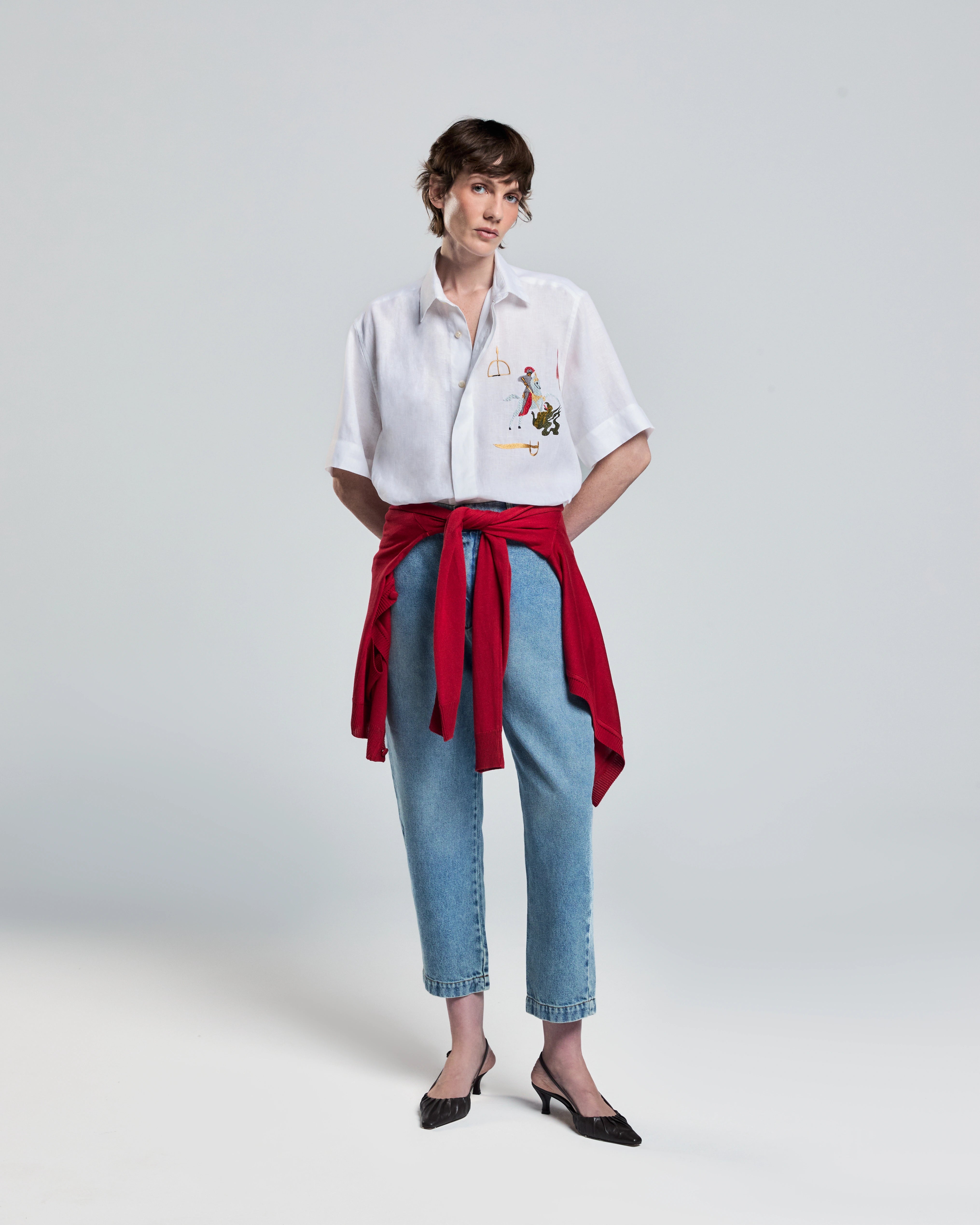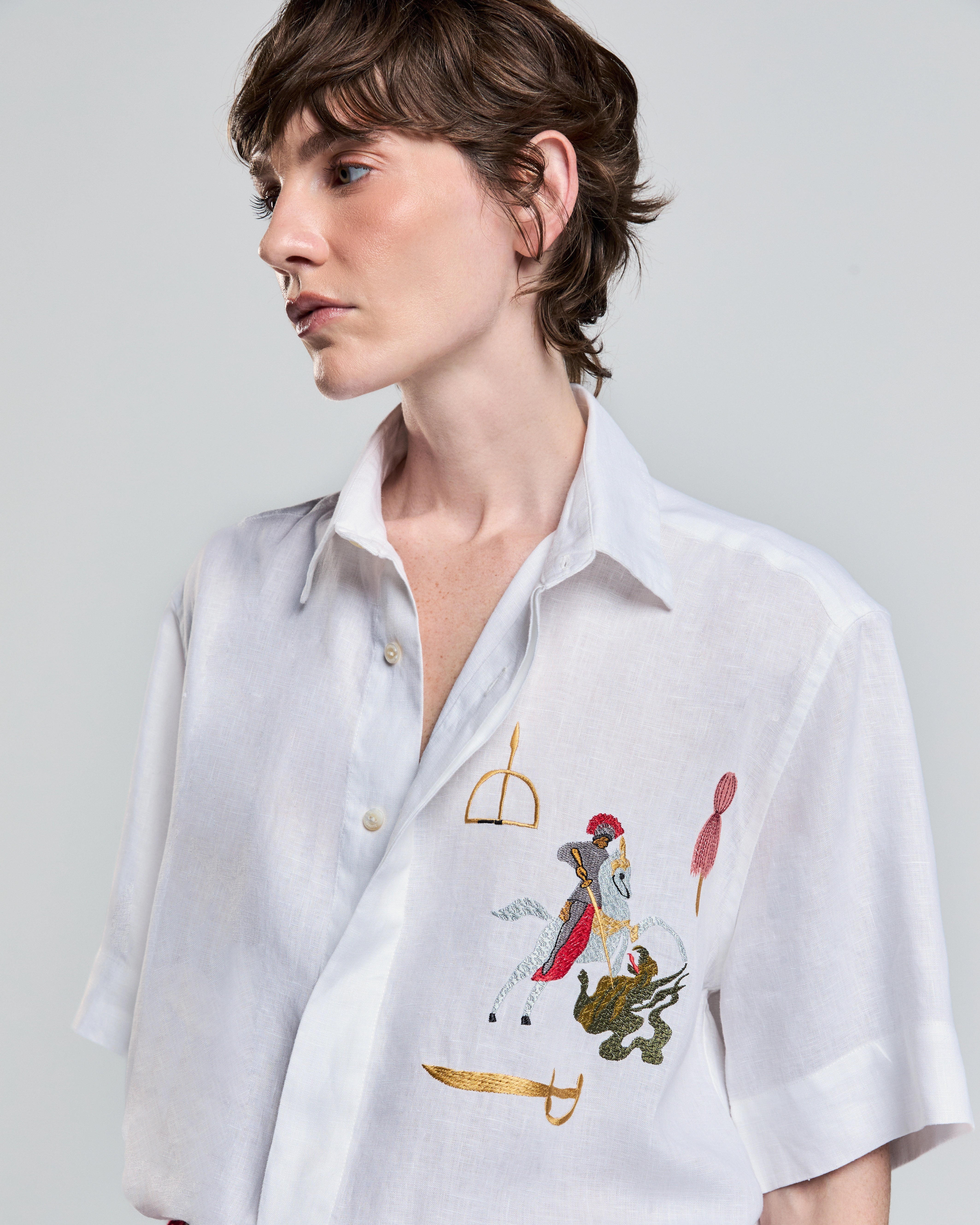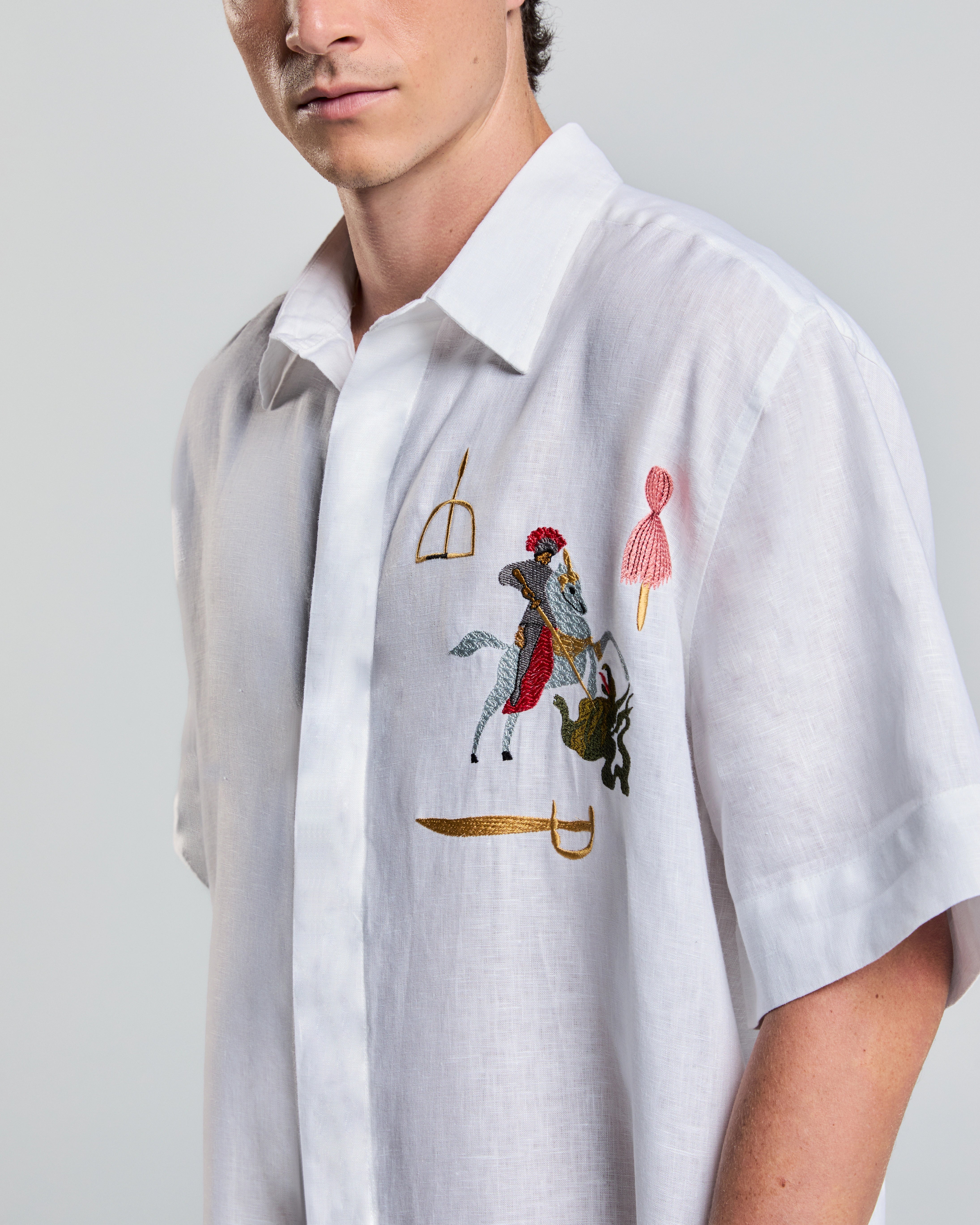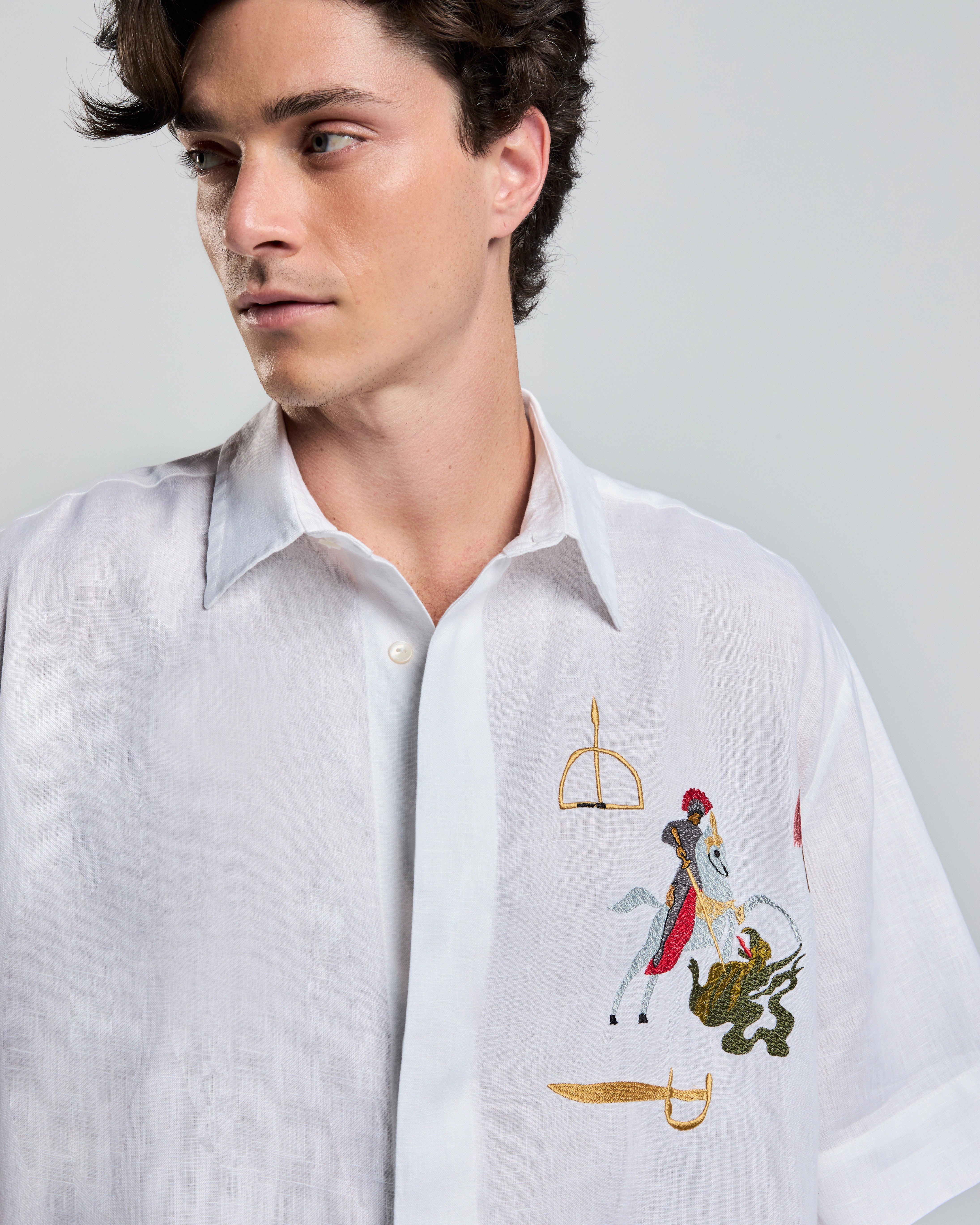 Camisa de linho com modelagem ampla e mangas curtas. Possui bordado localizado distribuído pela peça e abotoamento frontal embutido.