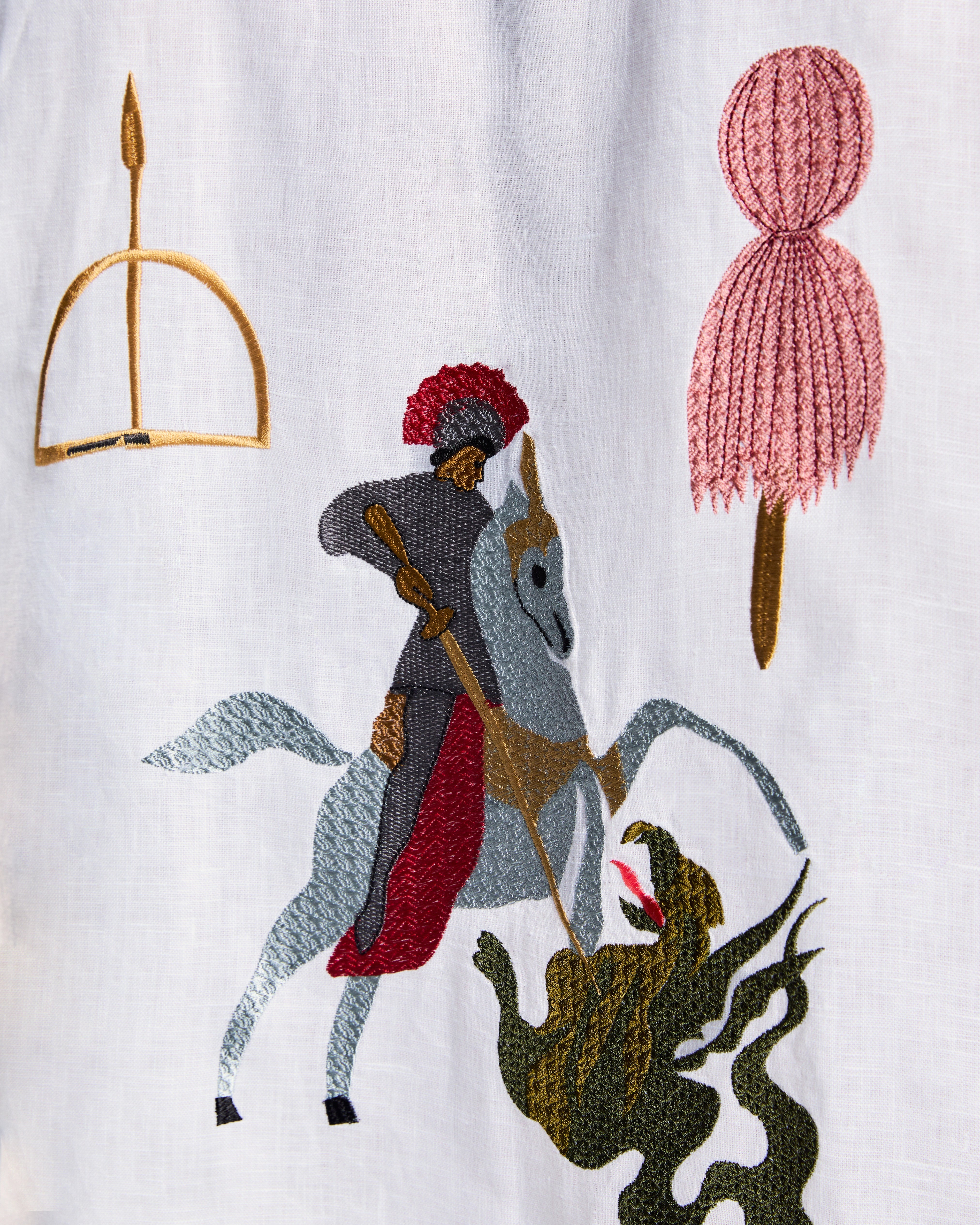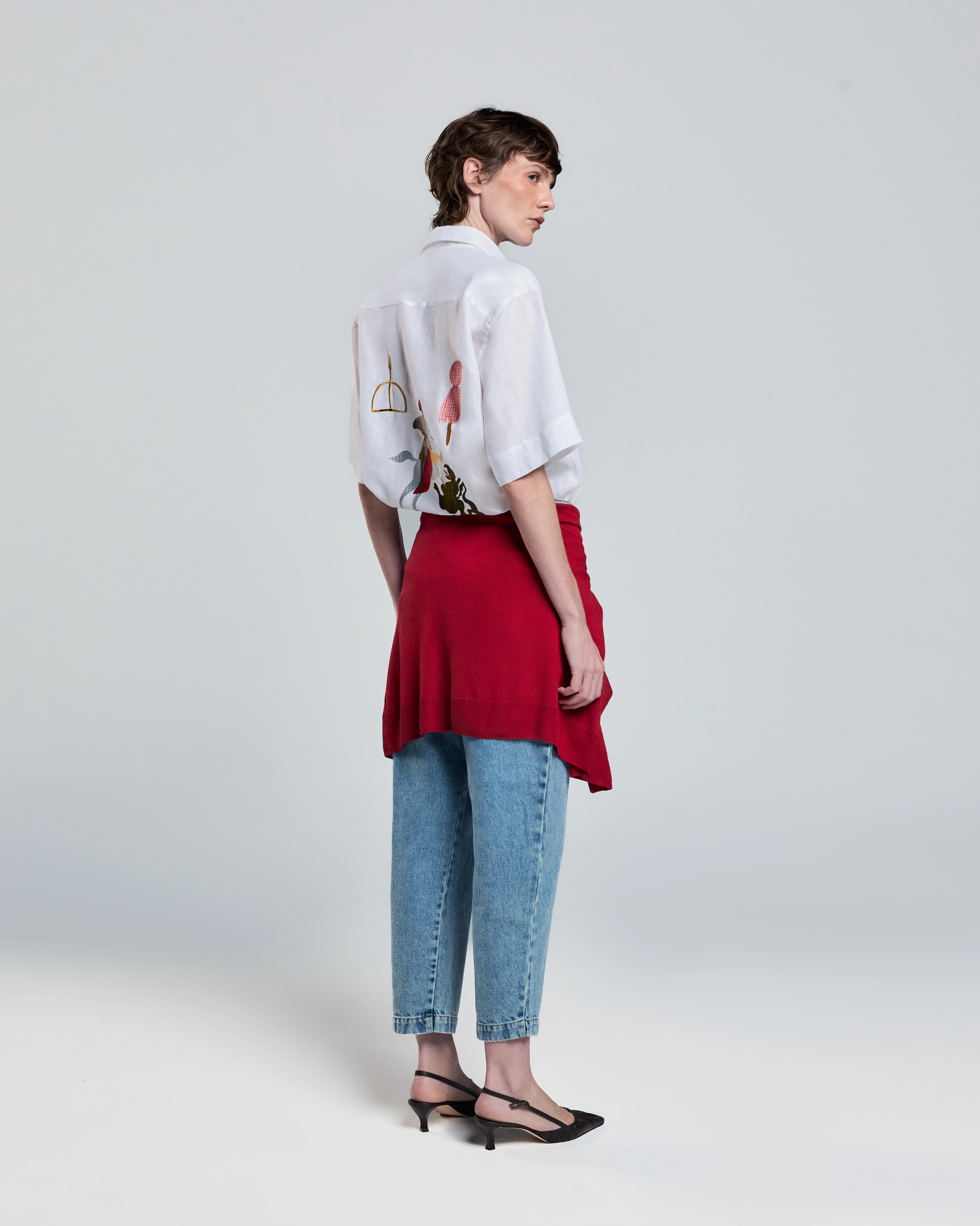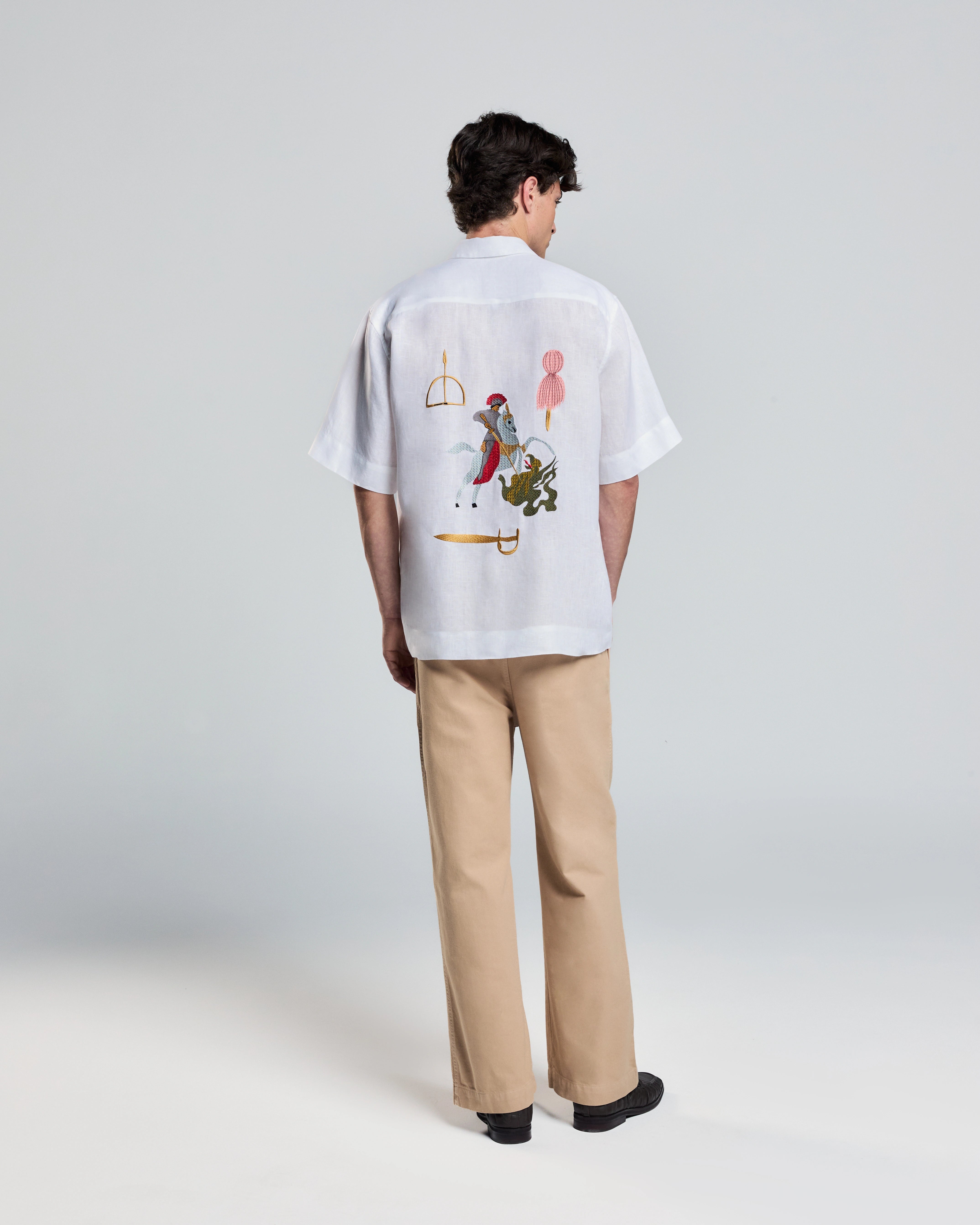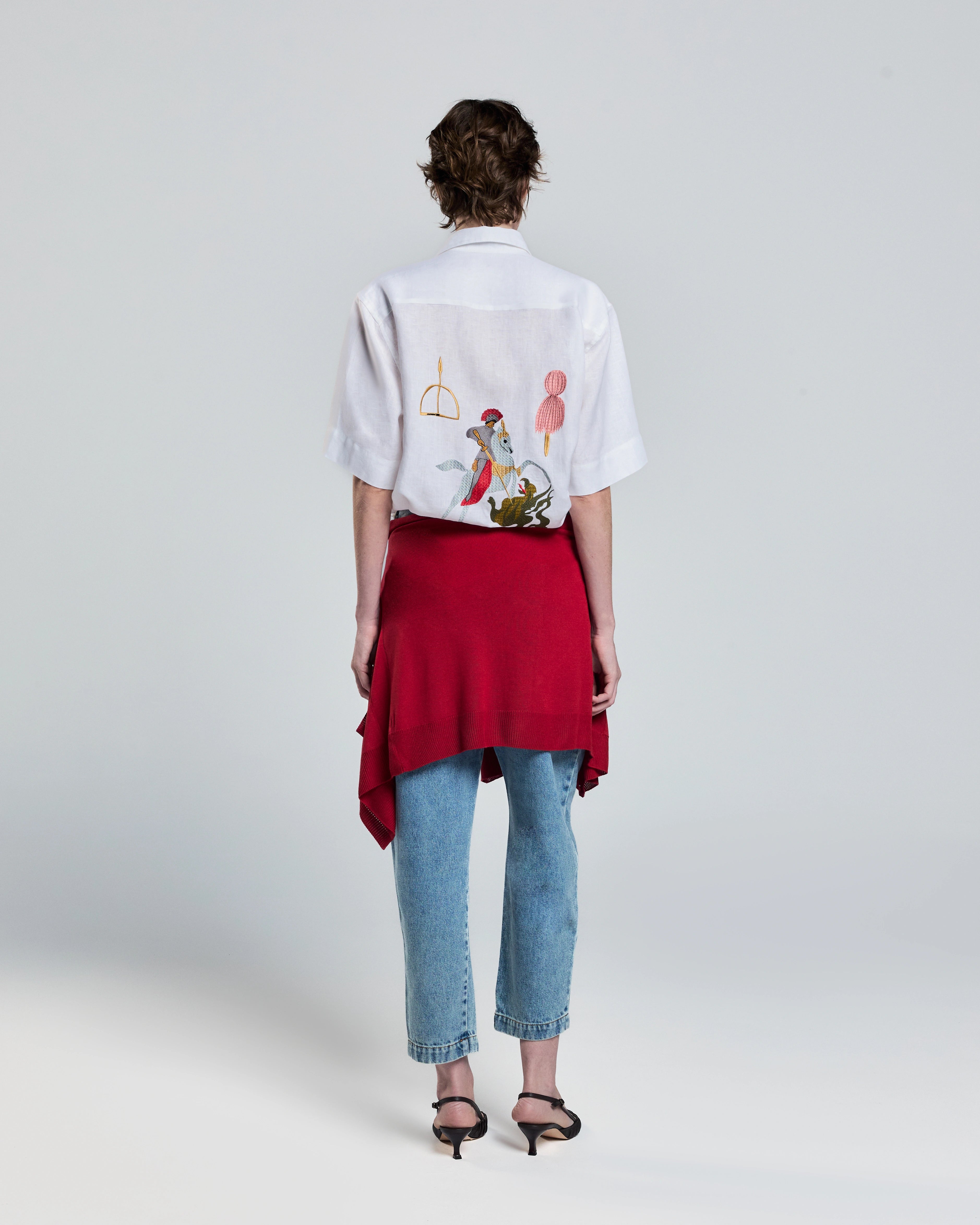 Camisa de linho com modelagem ampla e mangas curtas. Possui bordado localizado distribuído pela peça e abotoamento frontal embutido.