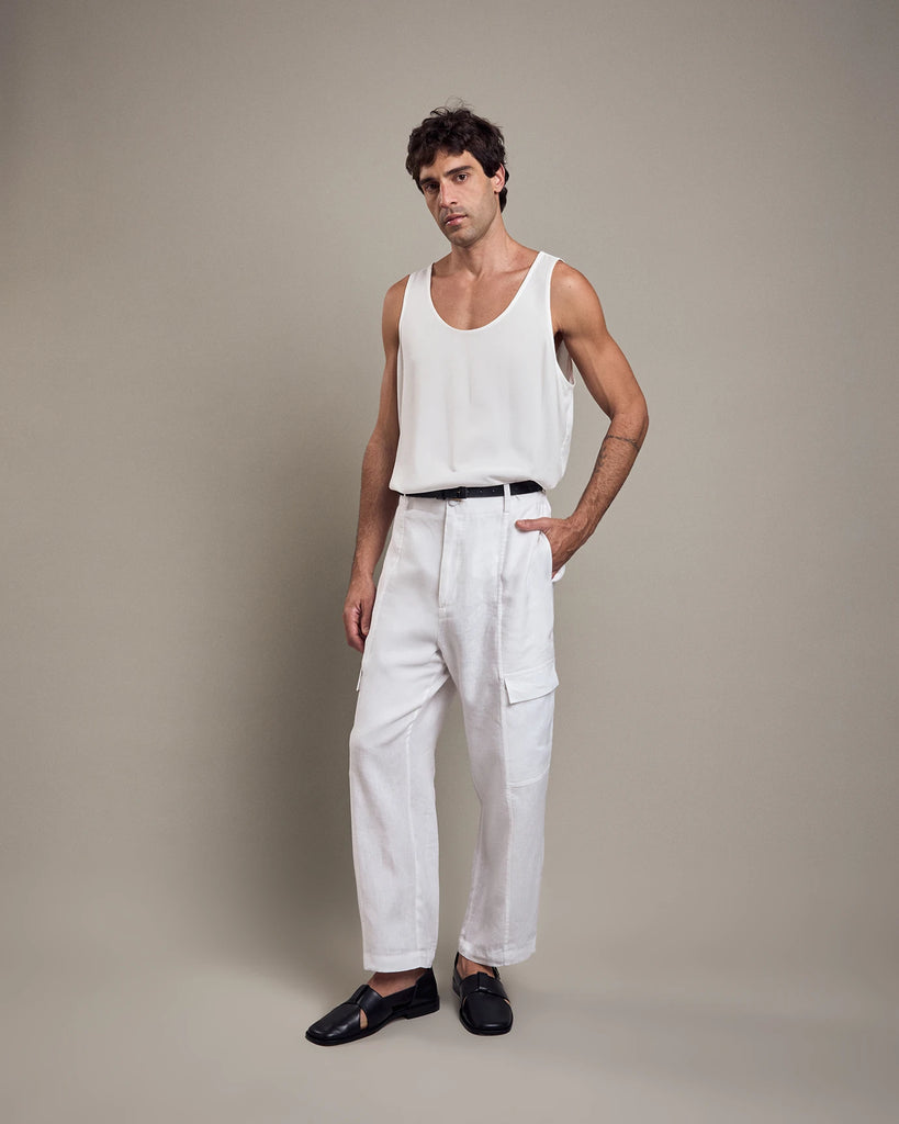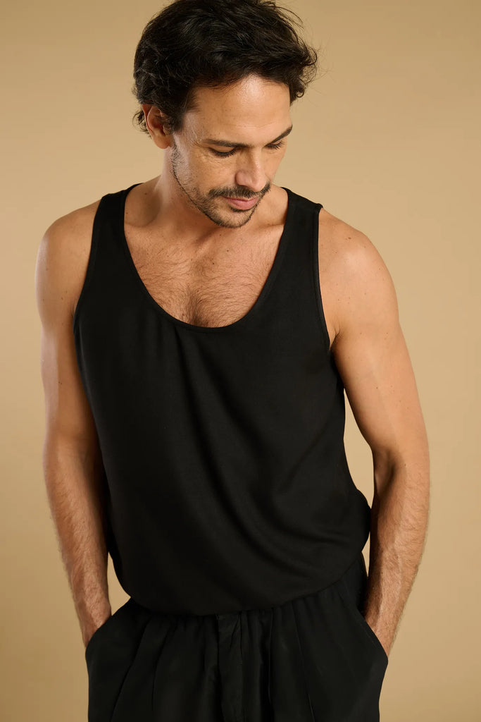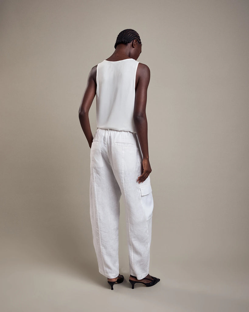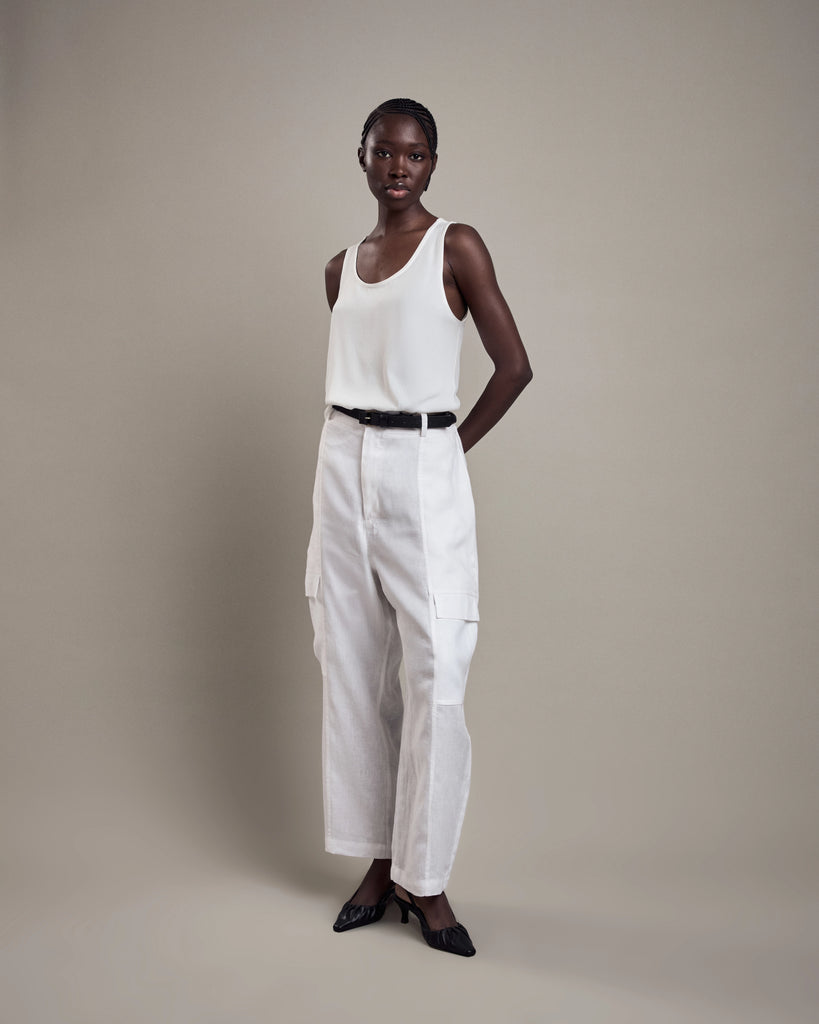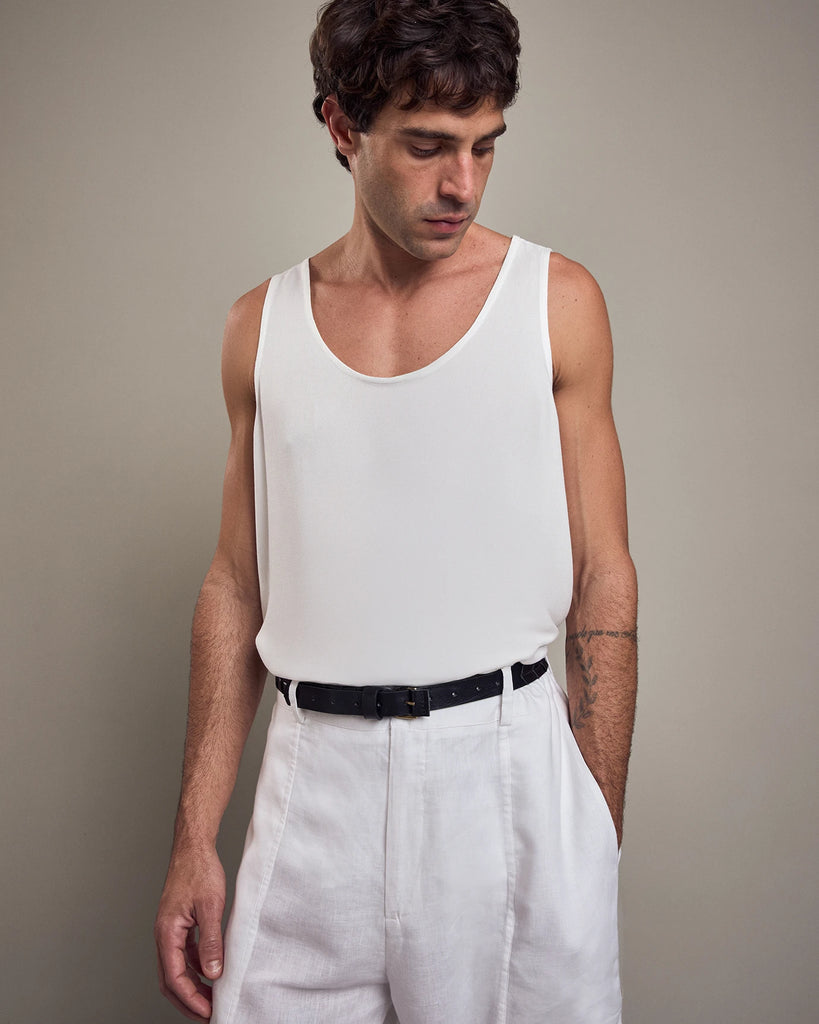 Loose fit, sleeveless, U-neckline and rounded sides.